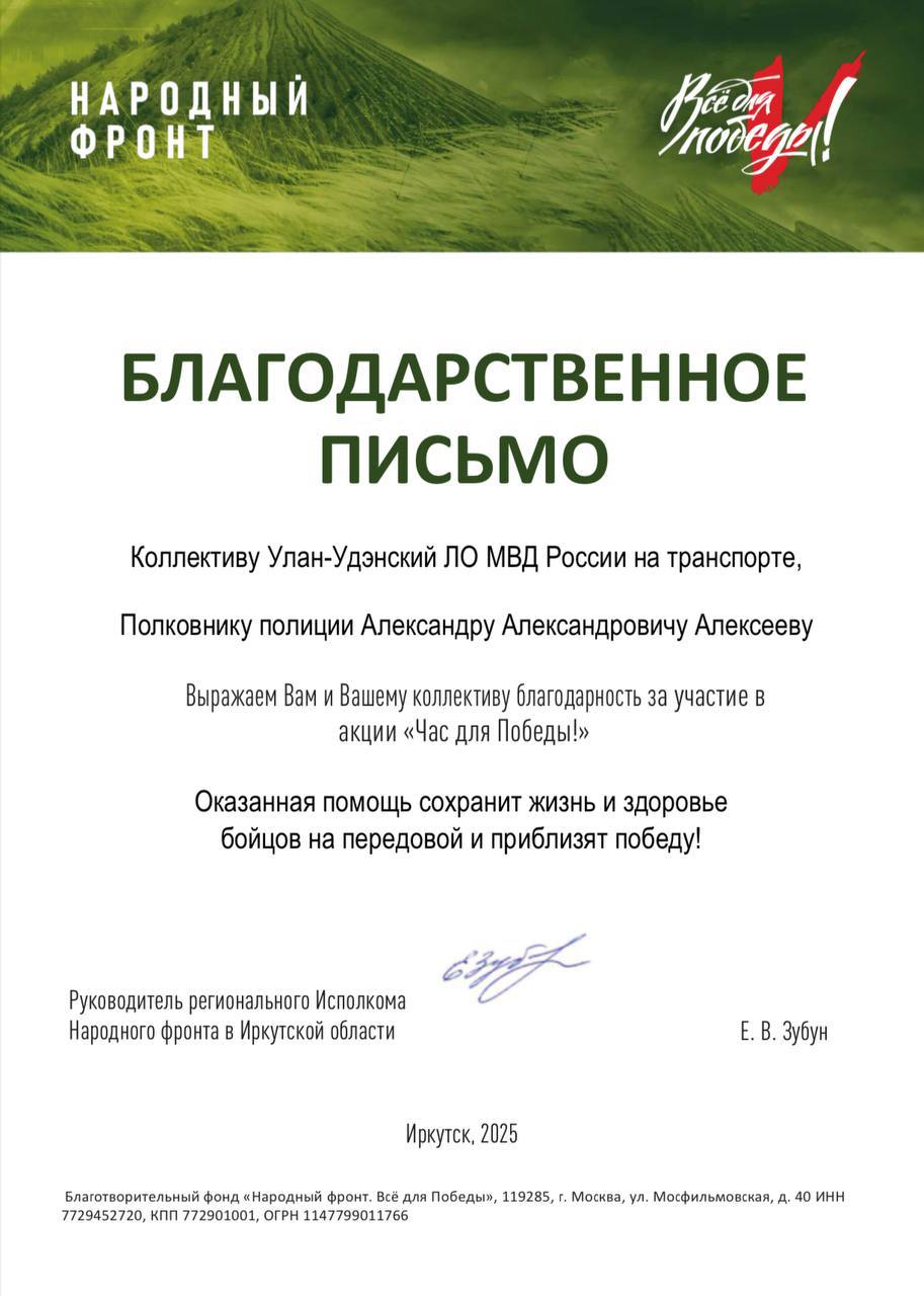 Кроме того, сотрудники Улан-Удэнского ЛО МВД России на транспорте поддержали благотворительную акцию Народного фронта «Час для Победы», собрав для военнослужащих СВО гуманитарную помощь.