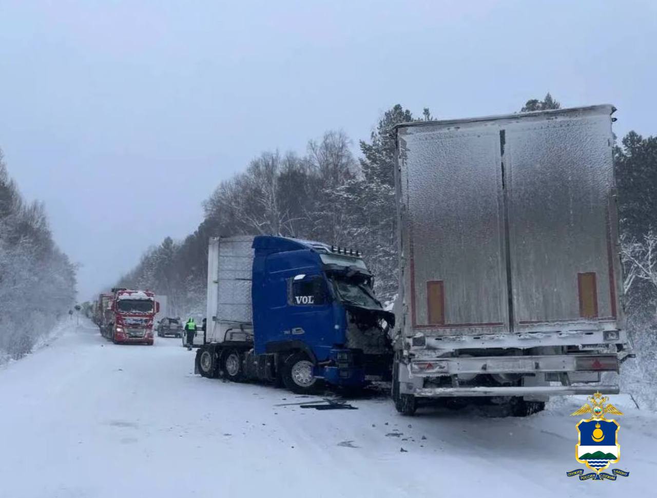 По предварительным данным, сегодня в районе с. Клюевка Кабанского района водитель большегрузного автомобиля «Ситрак», двигаясь по встречной полосе в неблагоприятных погодных условиях, совершил столкновение с другим большегрузным автомобилем с последующим съездом в кювет.
