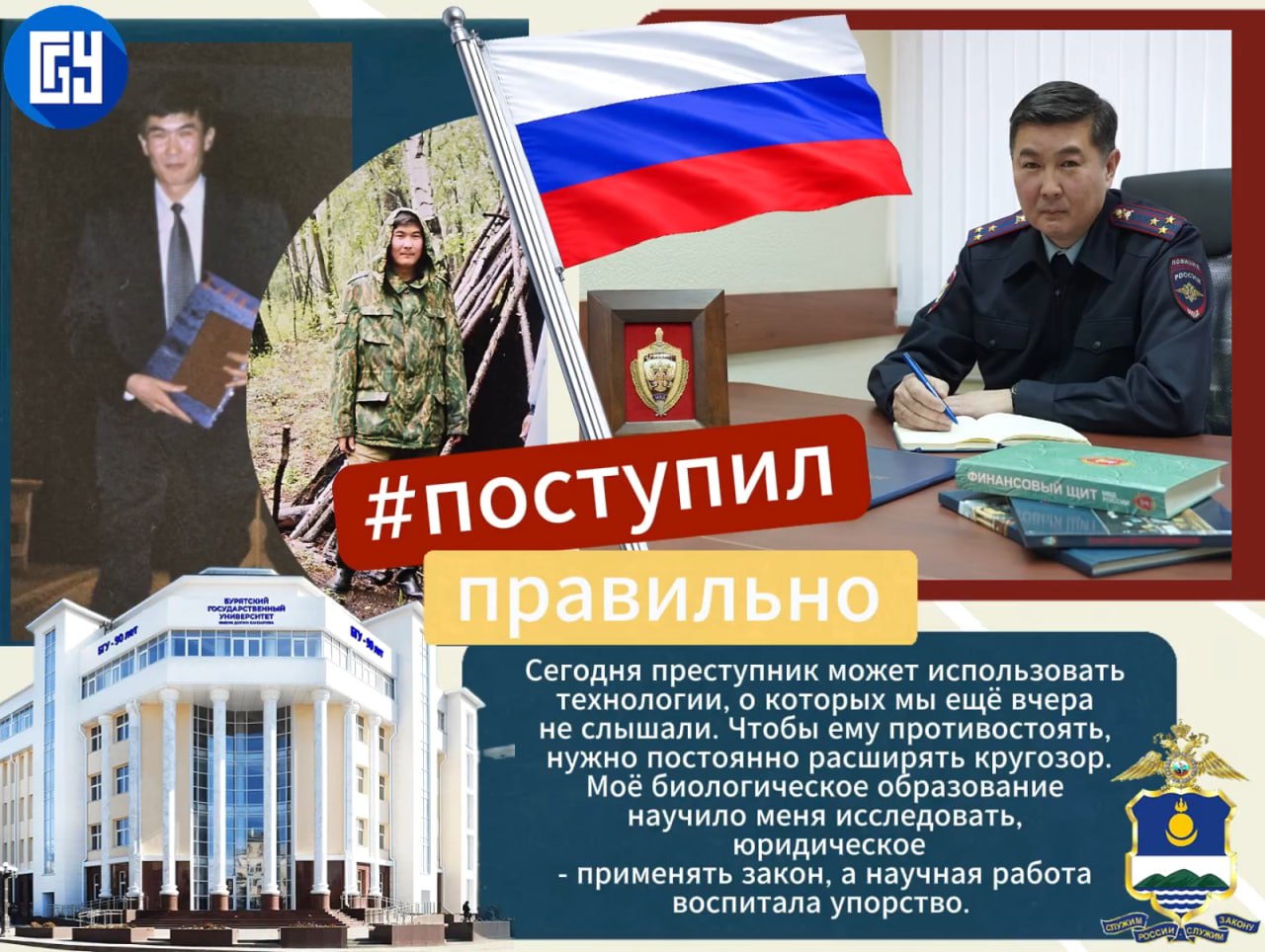 Начальник Управления по борьбе с кибермошенничеством МВД Бурятии Бато Баторович Базаржапов - пример сочетания профессионального опыта и академической подготовки. Его карьера является ярким примером того, насколько важен правильный выбор образовательного пути и непрерывное обучение для достижения высоких результатов в профессии.
