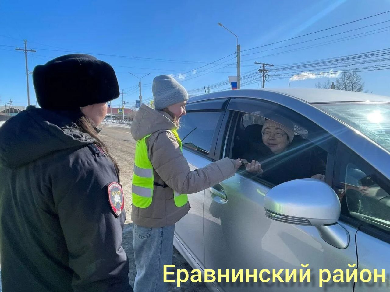В Еравнинском районе сотрудники ДПС вышли на дорогу вместе с юными инспекторами дорожного движения. Школьники помогали полицейским поздравлять водителей, вручая прекрасным дамам сладкие подарки и теплые пожелания.