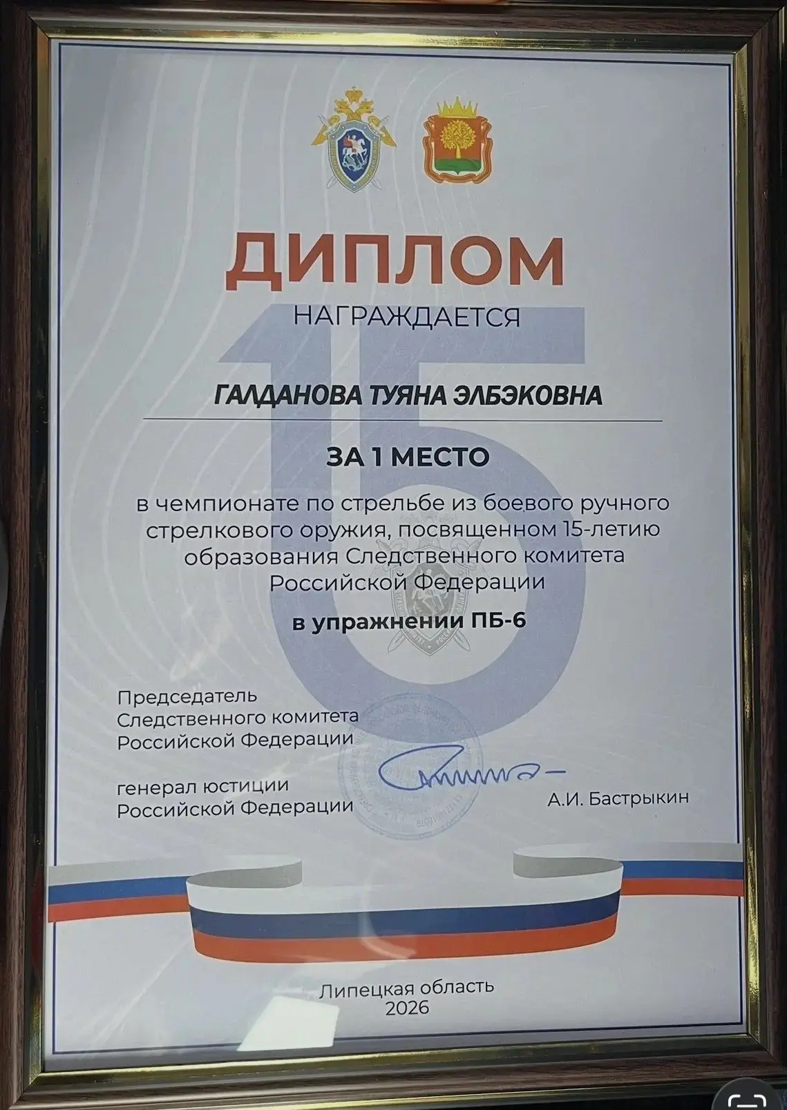 Первое место на чемпионате в личном зачете при выполнении упражнения ПБ-6, входящего в правила служебно-прикладного вида спорта и предусматривающего скоростную стрельбу из боевого пистолета со сменой магазина по мишени с дистанции 25 м., заняла сотрудница нашего следственного управления - старший следователь первого отдела по расследованию особо важных дел Туяна Галданова, которая ранее неоднократно становилась призером и местных соревнований, проходивших в Бурятии среди сотрудников правоохранительных органов. Она набрала 82 очка из 100 и стала лучшей среди девушек.