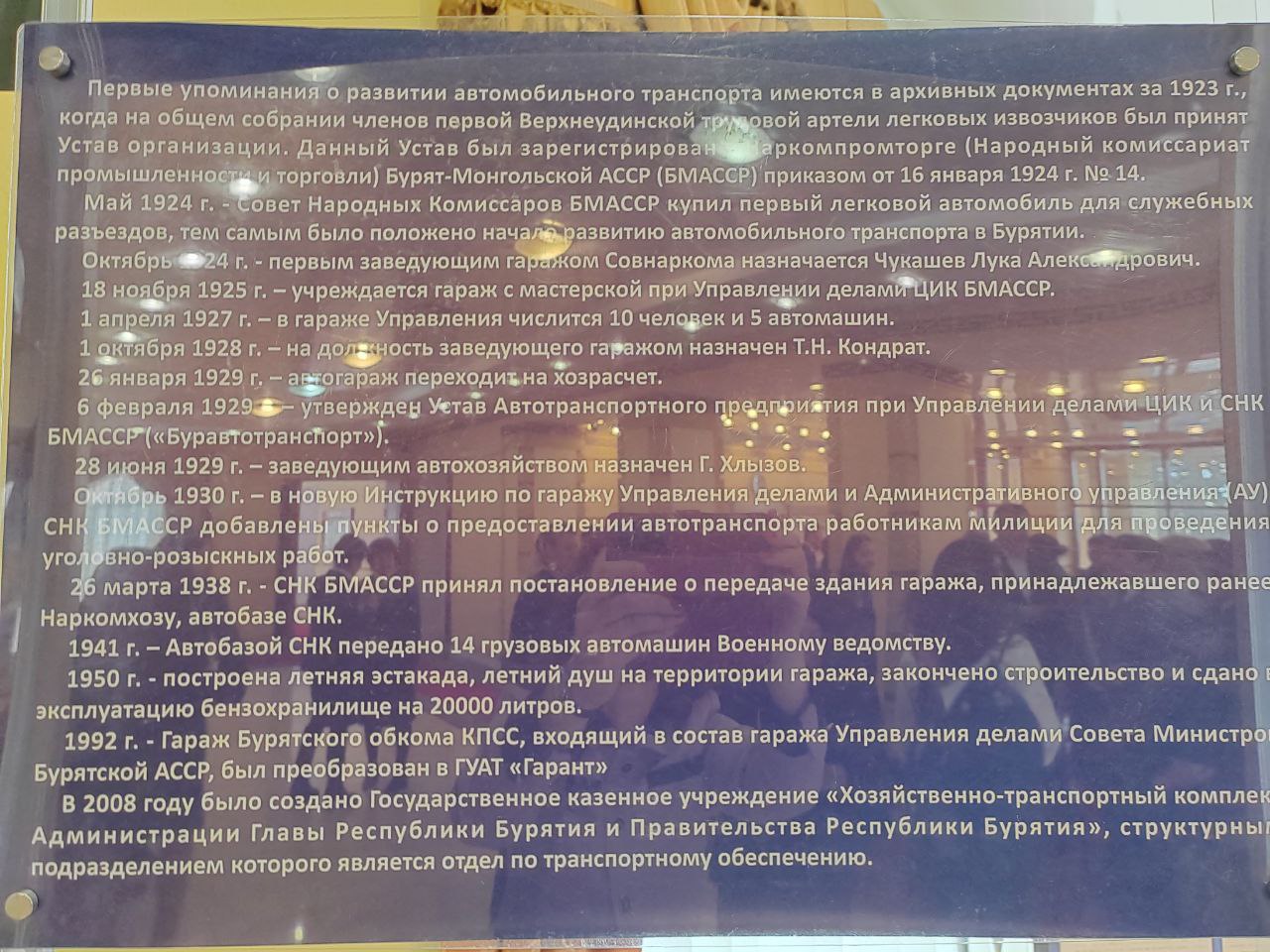 В здании правительства Бурятии открылась выставка, посвященная 100-летию гаражного комплекса. Когда - то здесь было 5 машин и работало 10 человек.Фото: Новая Бурятия