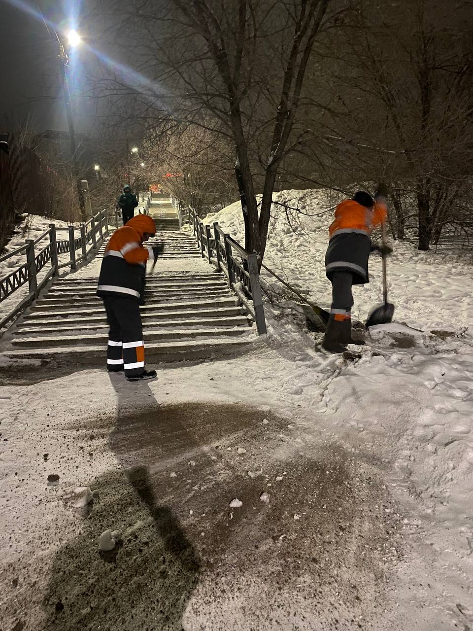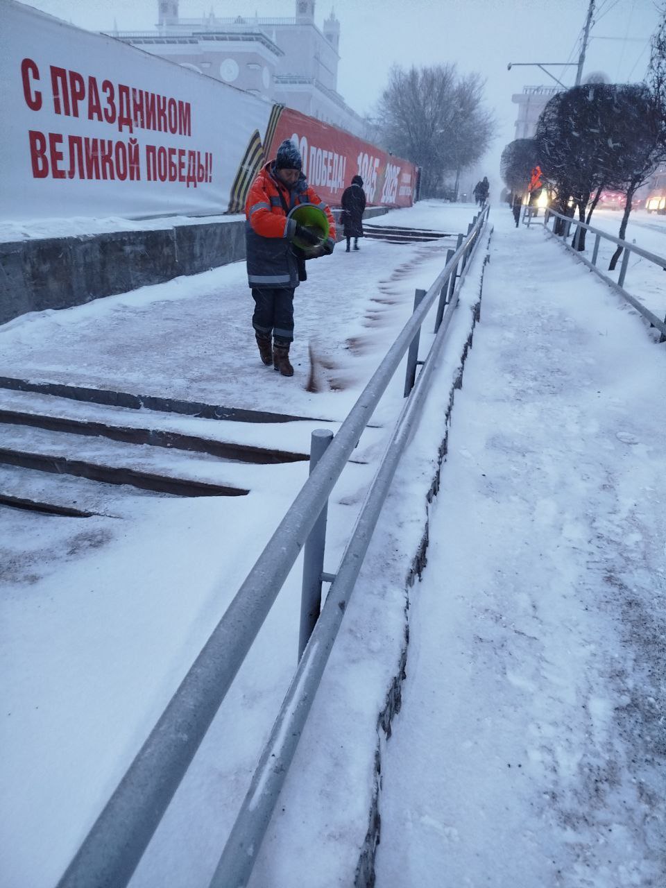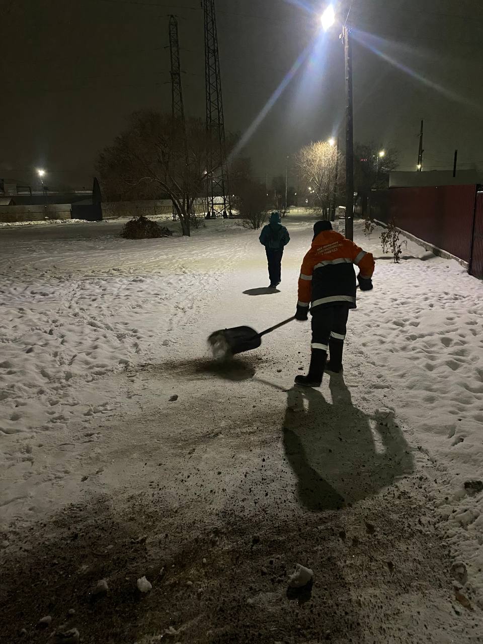 В 6:00 на уборку и подсыпку тротуаров вышли 120 уборщиков территорий Комбината по благоустройству и дворники управляющих компаний и ТСЖ.