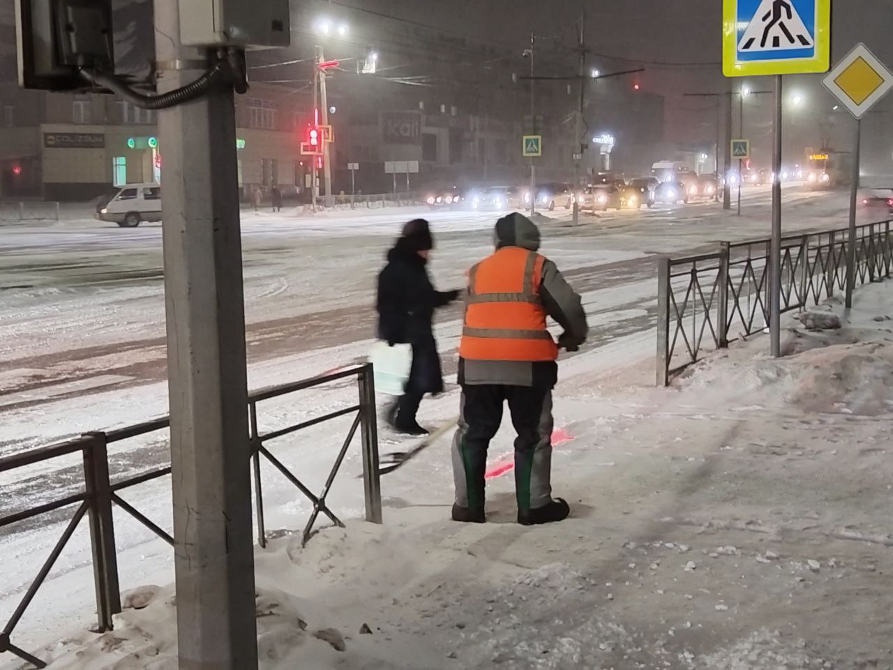 На протяжении всего дня они будут убирать снег и подсыпать песок на тротуарах, лестницах, пешеходных переходах и т.д.