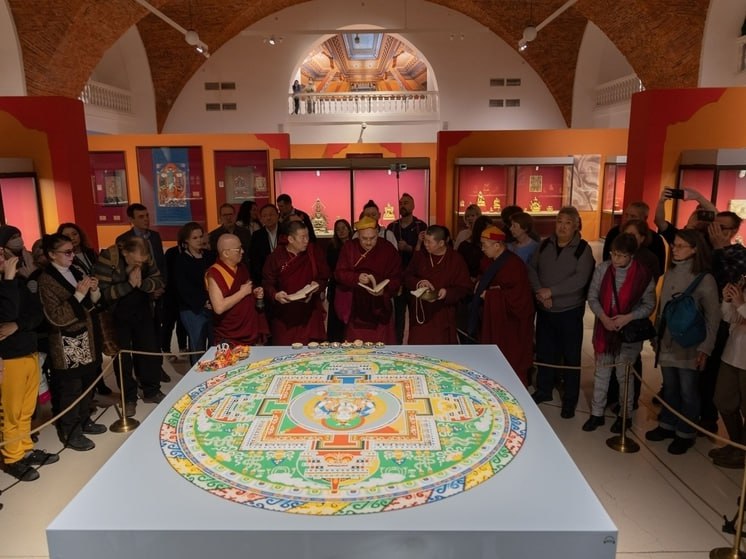 В Санкт-Петербурге прошла церемония ритуального разрушения песочной мандалы, которая была центральным элементом выставки «Драгоценность в лотосе» в Государственном Эрмитаже.