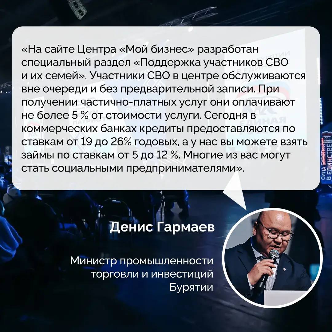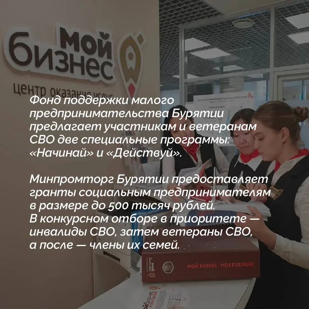 В конце прошлого года при поддержке Правительства Бурятии в партнерстве с партией «Единая Россия», общественной организацией «Опора России» и корпорацией МСП проведена федеральная программа «СВОй бизнес» для ветеранов СВО и членов их семей.