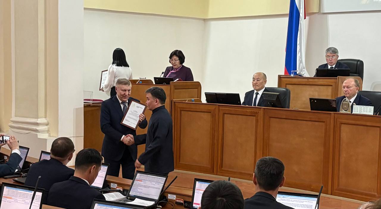 Церемонию награждения продолжил Председатель Народного Хурала Владимир Павлов, вручивший за добросовестный труд и вклад в развитие республиканского законодательства и парламентаризма Почетные грамоты НХ РБ депутатам Николаю Дашееву и Вячеславу Дондокову. Руководитель парламента поздравил награжденных с заслуженными наградами, пожелав плодотворной работы на благо Республики Бурятия и Российской Федерации!