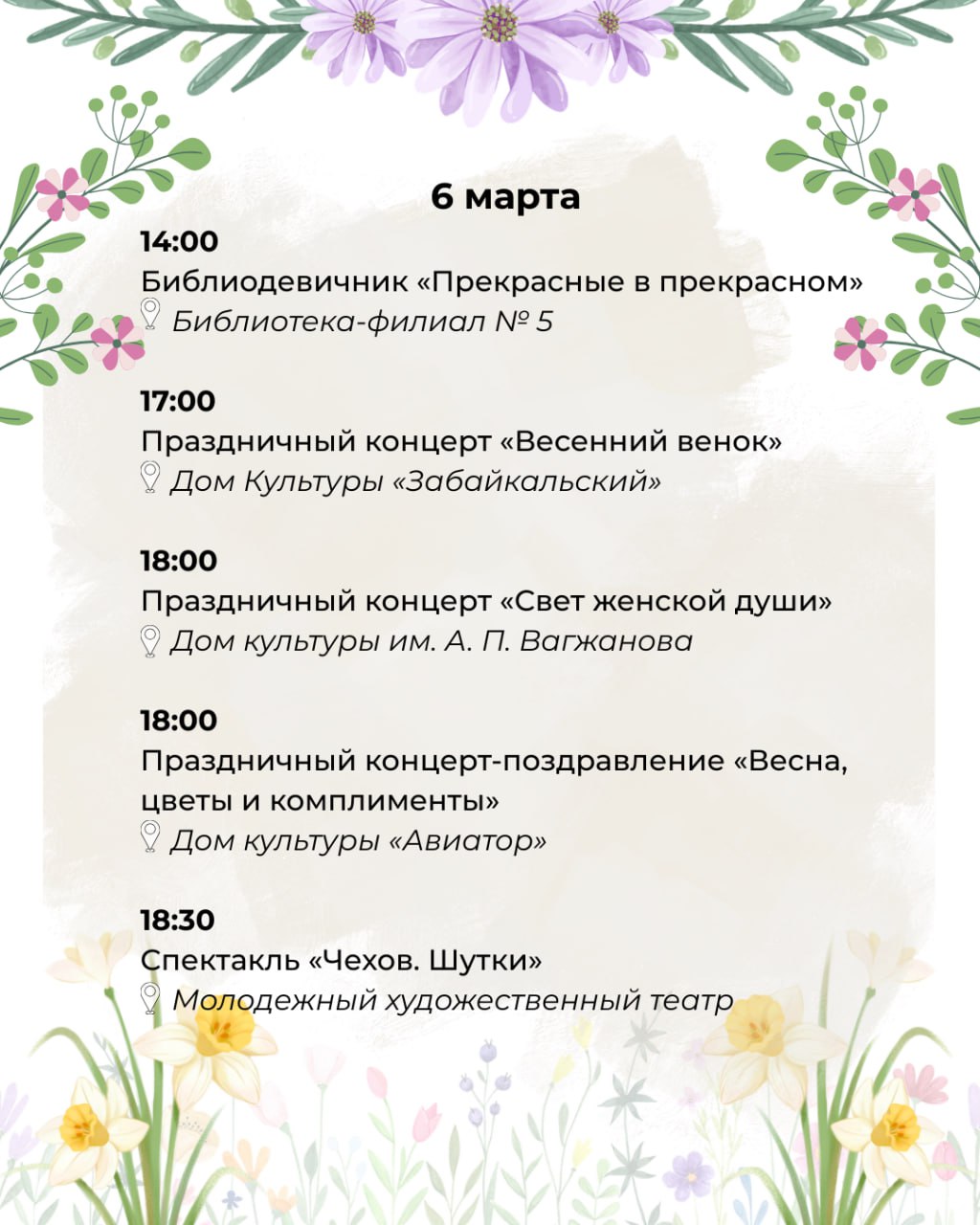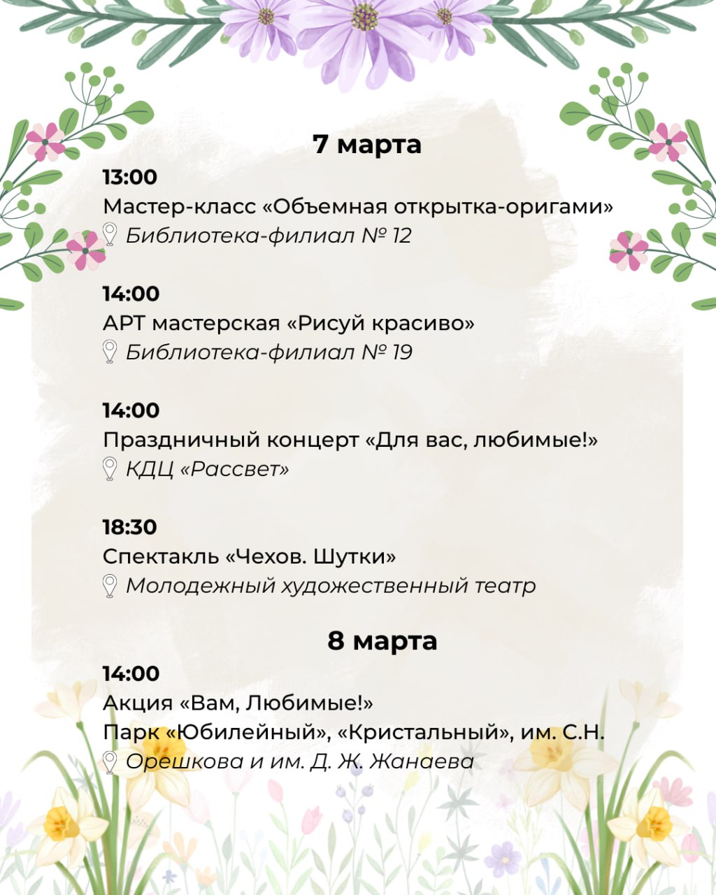 Учреждения культуры города подготовили яркие концерты, мастер-классы и множество сюрпризов ко Дню, когда женщины сияют улыбками ярче всего — 8 марта.Куда и когда идти – смотрите в наших карточках.