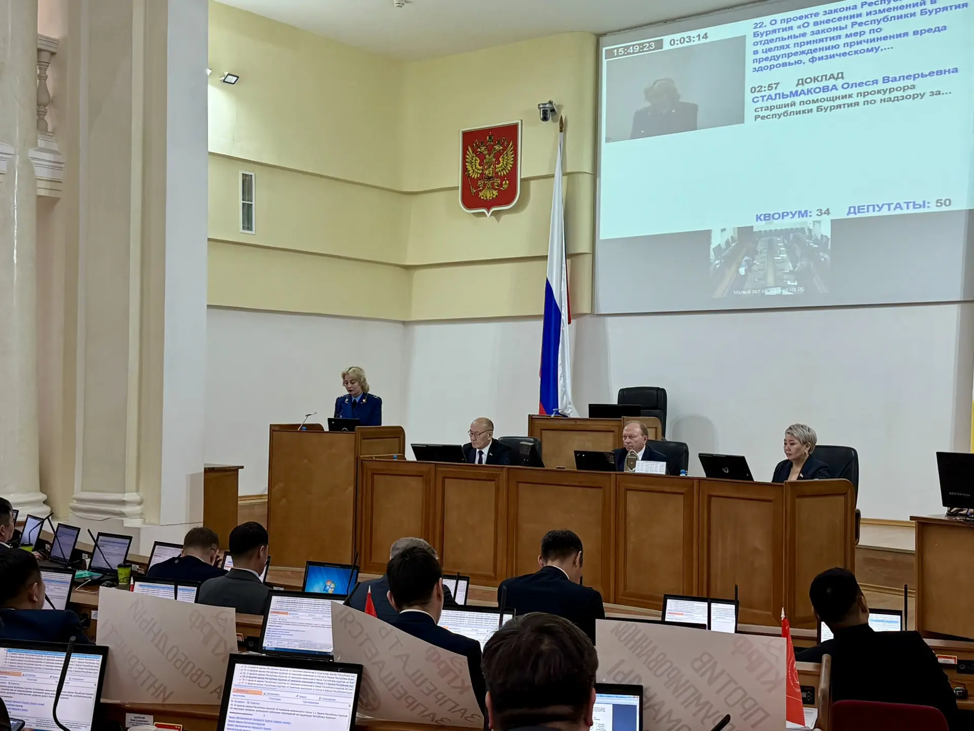 Старший помощник прокурора по надзору за исполнением законов о несовершеннолетних и молодежи Олеся Стальмакова выступила на сессии НХ по вопросу о проекте закона РБ «О внесении изменений в отдельные законы Республики Бурятия в целях принятия мер по предупреждению причинения вреда здоровью, физическому, интеллектуальному, психическому, духовному и нравственному развитию детей в Республике Бурятия». Содокладчиком стал председатель Комитета Народного Хурала по социальной политике Игорь Марковец.