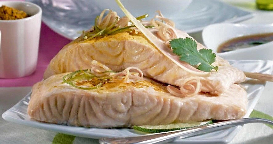 - Семга томленая в масле с пряными травами. Это блюдо отличается отменной маслянистой текстурой и прекрасно подходит для подачи с овощным гарниром или ризотто.