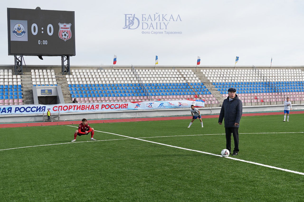 Он же нанёс символический удар по мячу перед матчем Третьей лиги «Бурятия» - «Полимер» (Барнаул).