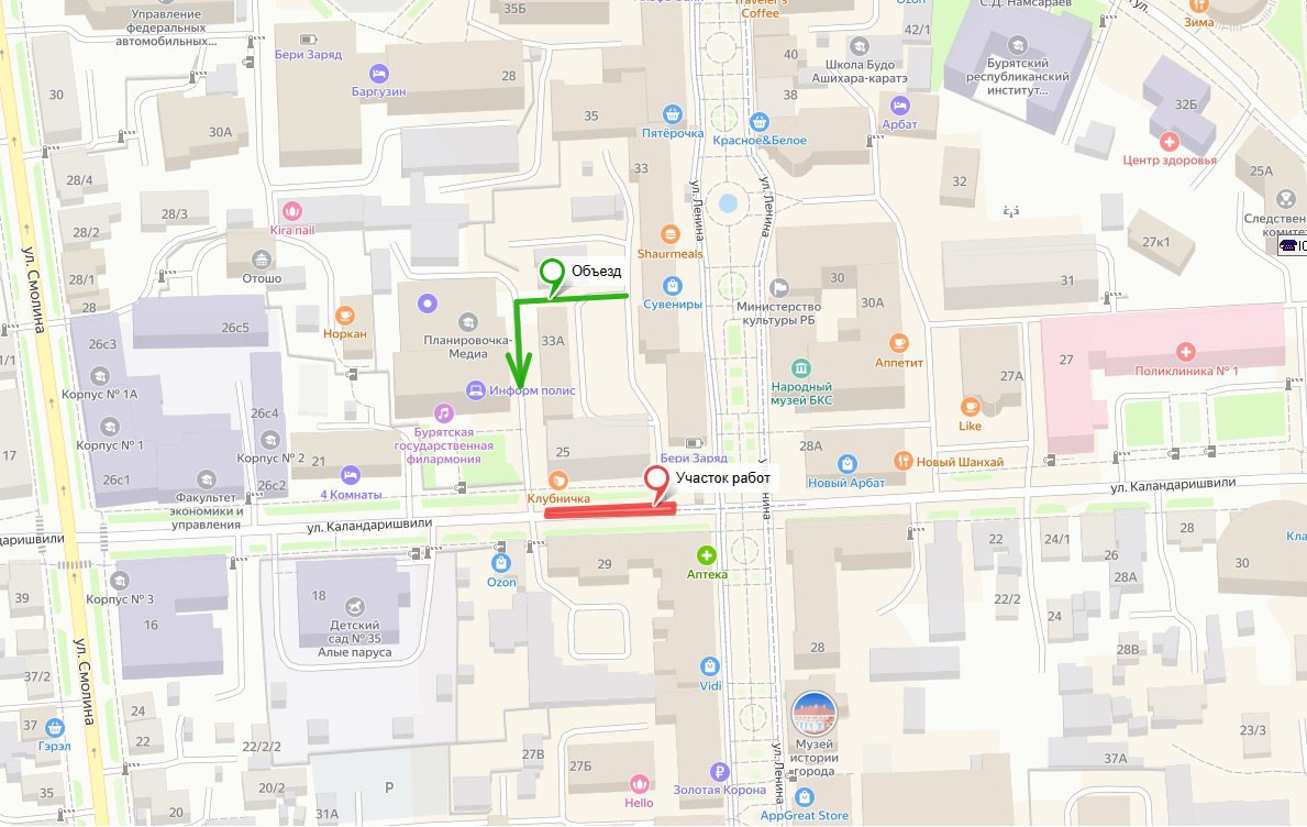 Также временно ограничен въезд во дворы жилых домов по улице Ленина, 31 и 33. Жителям рекомендовано использовать объезд со стороны улицы Каландаришвили, дом 23.