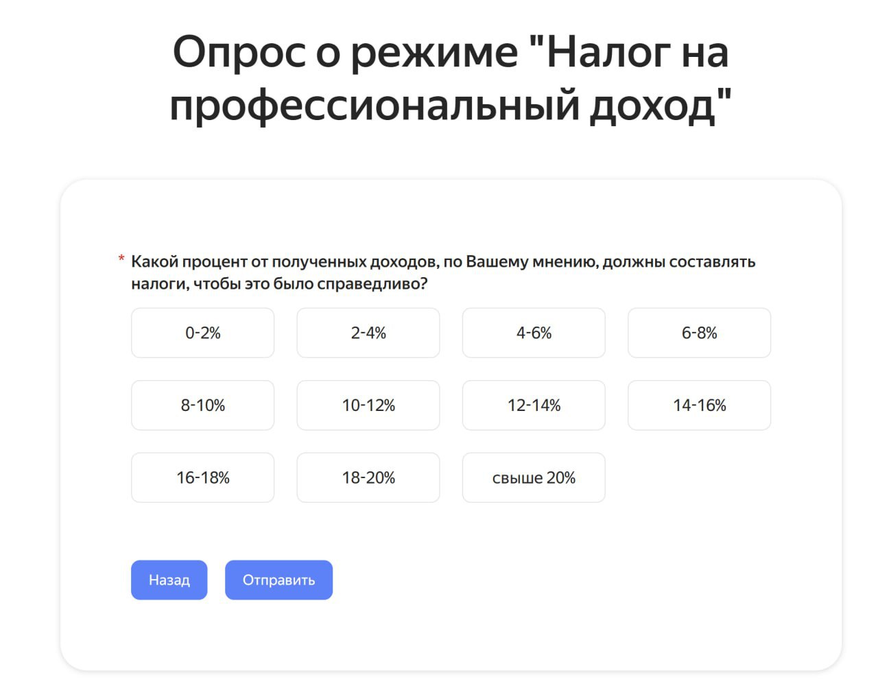 Участникам опроса также предлагают определить, какой процент от дохода они считают «справедливым» для уплаты в качестве налога. Варианты ответов охватывают диапазон от 0% до более чем 20%.