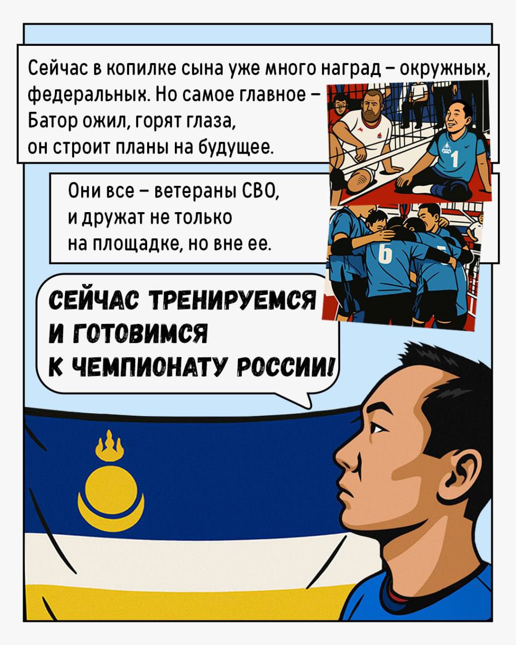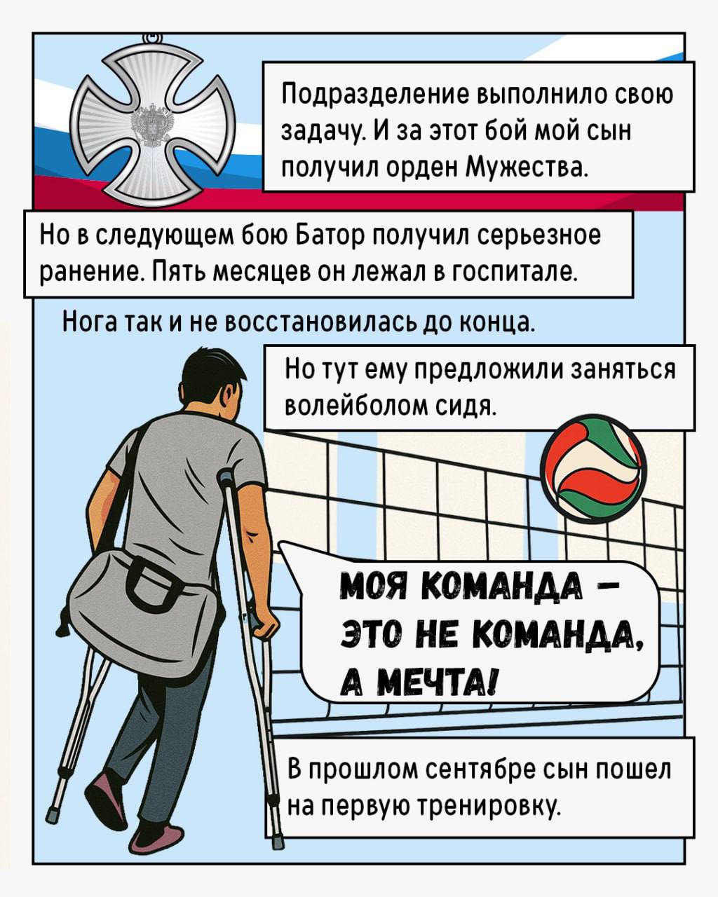 После возвращения с СВО и серьезного ранения именно волейбол сидя помог Батору снова поверить в себя. О нем он узнал в филиале фонда «Защитники Отечества».