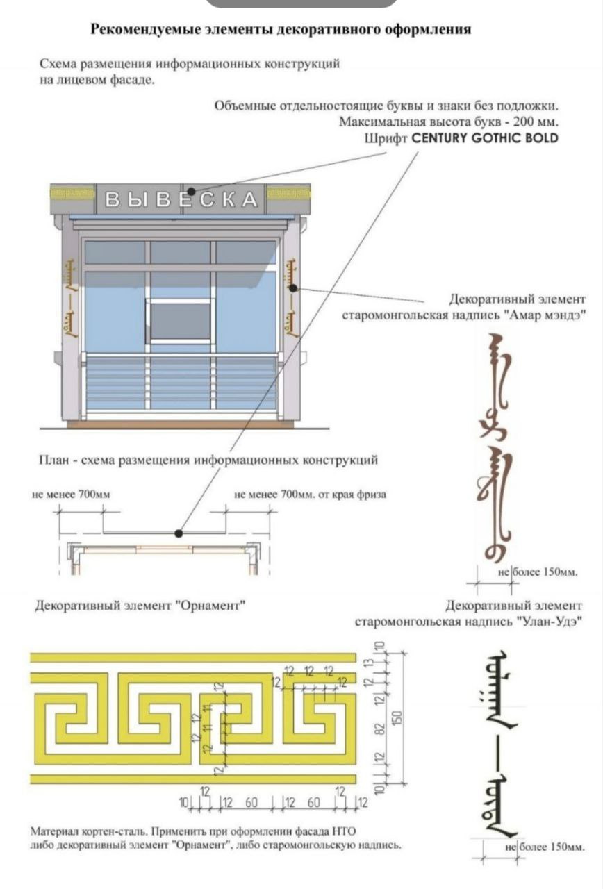 Согласно правилам благоустройства Улан-Удэ, процент остекления павильонов должен составлять не менее 80%, боковых фасадов – не менее 50%. Высота строения должна быть не более 3,5 метров.