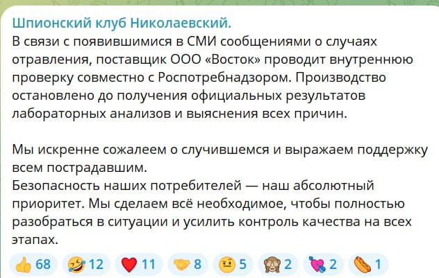 «В связи с появившимися в СМИ сообщениями о случаях отравления, поставщик ООО «Восток» проводит внутреннюю проверку совместно с Роспотребнадзором. Производство остановлено до получения официальных результатов лабораторных анализов и выяснения всех причин», — сообщили в компании.