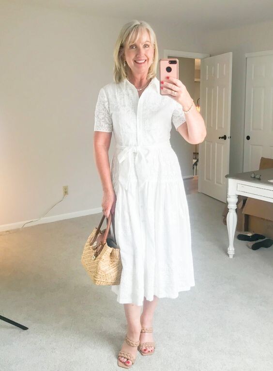 - Кружевное белое платье А-силуэта: Элегантное и воздушное, с короткими рукавами и длиной до середины лодыжки, это платье очарует своей женственностью. Пояс акцентирует талию, а легкие сандалии с плетеными ремешками создадут завершенный образ.