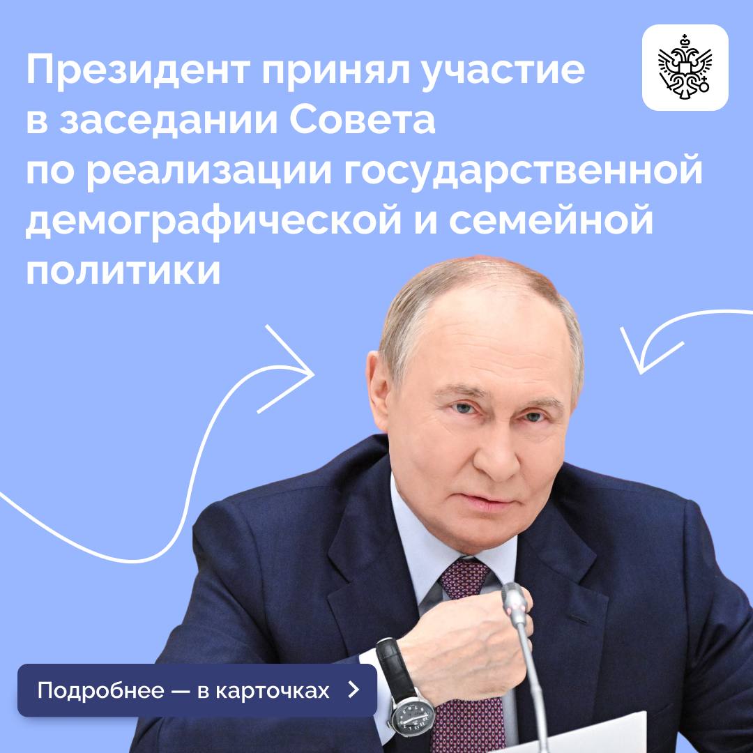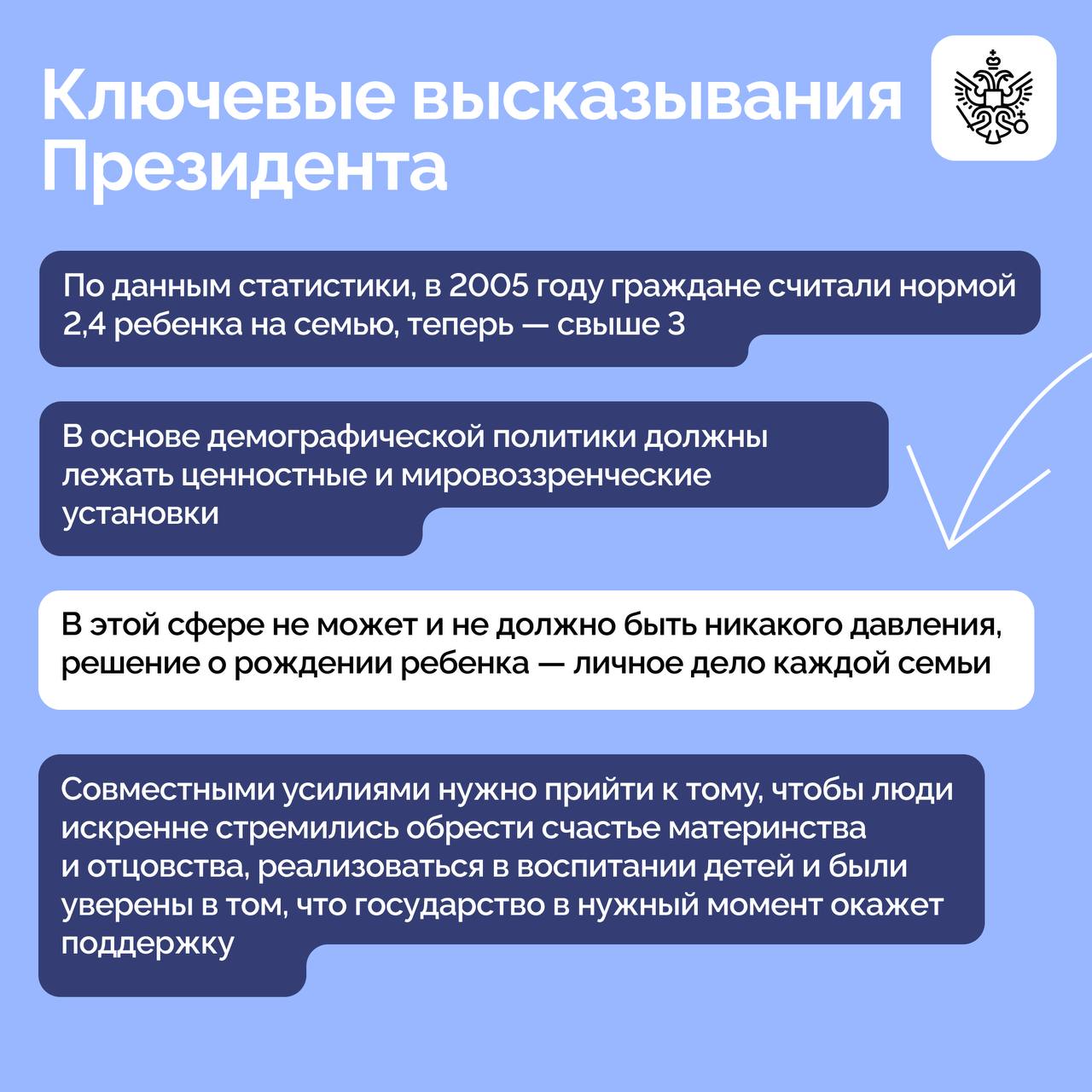 Президент напомнил, что поддержка семьи, создание условий для того, чтобы в России рождалось как можно больше детей, — важнейшее направление всех нацпроектов и стратегических планов развития.