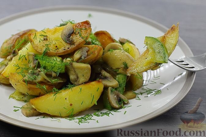 - Жареная картошка с грибами и кабачками: Этот классический рецепт непременно порадует гурманов. Когда хрустящие кусочки картофеля объединяются с нежными кабачками и ароматными грибами, получается прекрасное сочетание, насыщающее вкусом и текстурой.