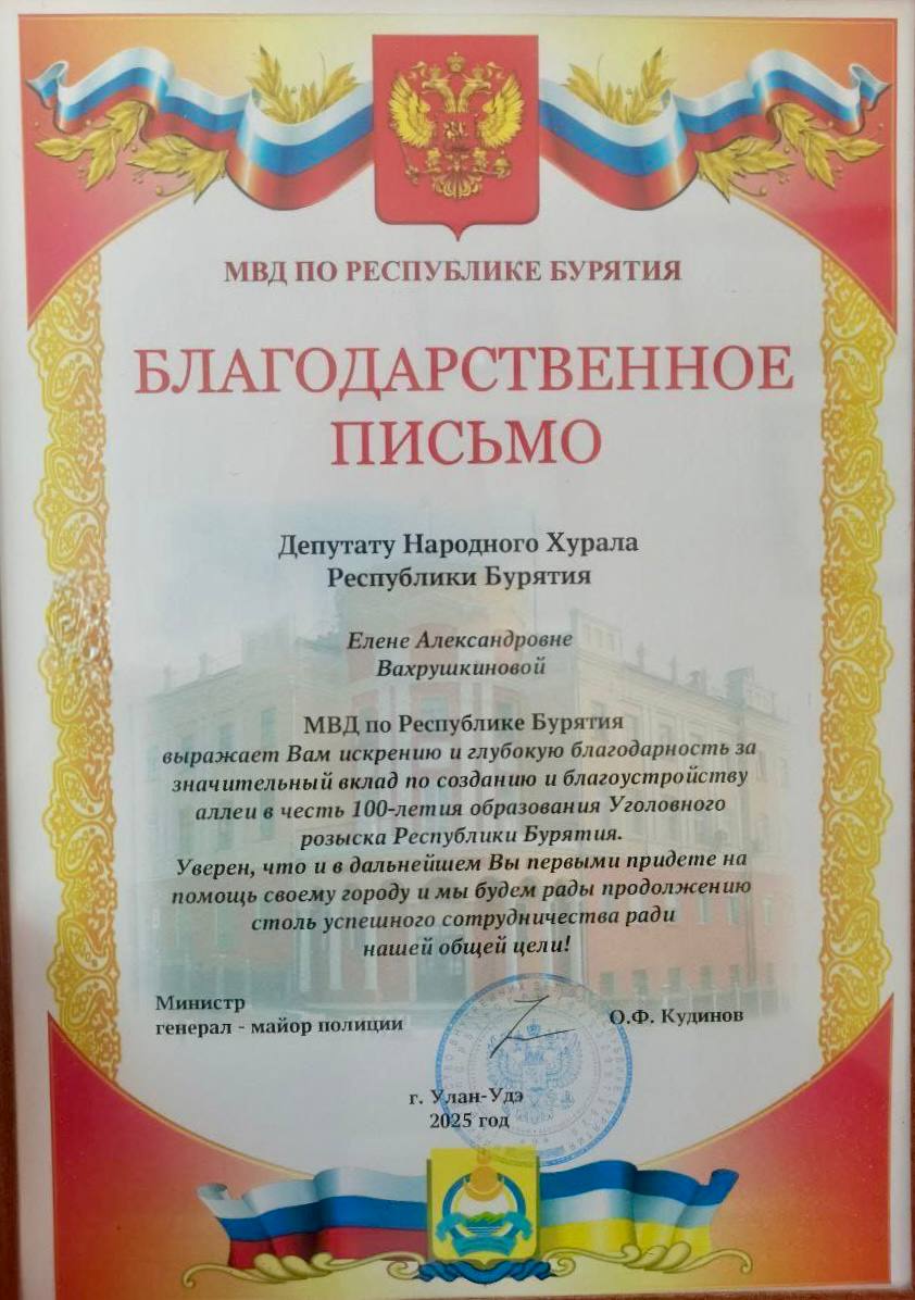 Елена Александровна Вахрушкинова внесла значительный вклад в создание и благоустройство аллеи в честь 100-летия образования Уголовного розыска Республики Бурятия. Благодаря её поддержке на улице Ключевской в Улан-Удэ посажены 25 голубых елей, дорожка аллеи выложена тротуарной плиткой, установлен бордюр и пандусы.