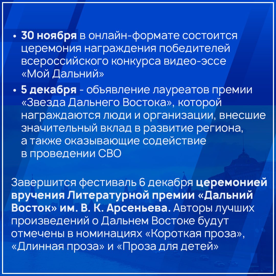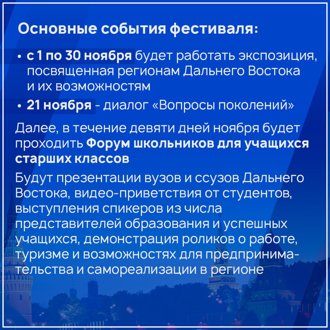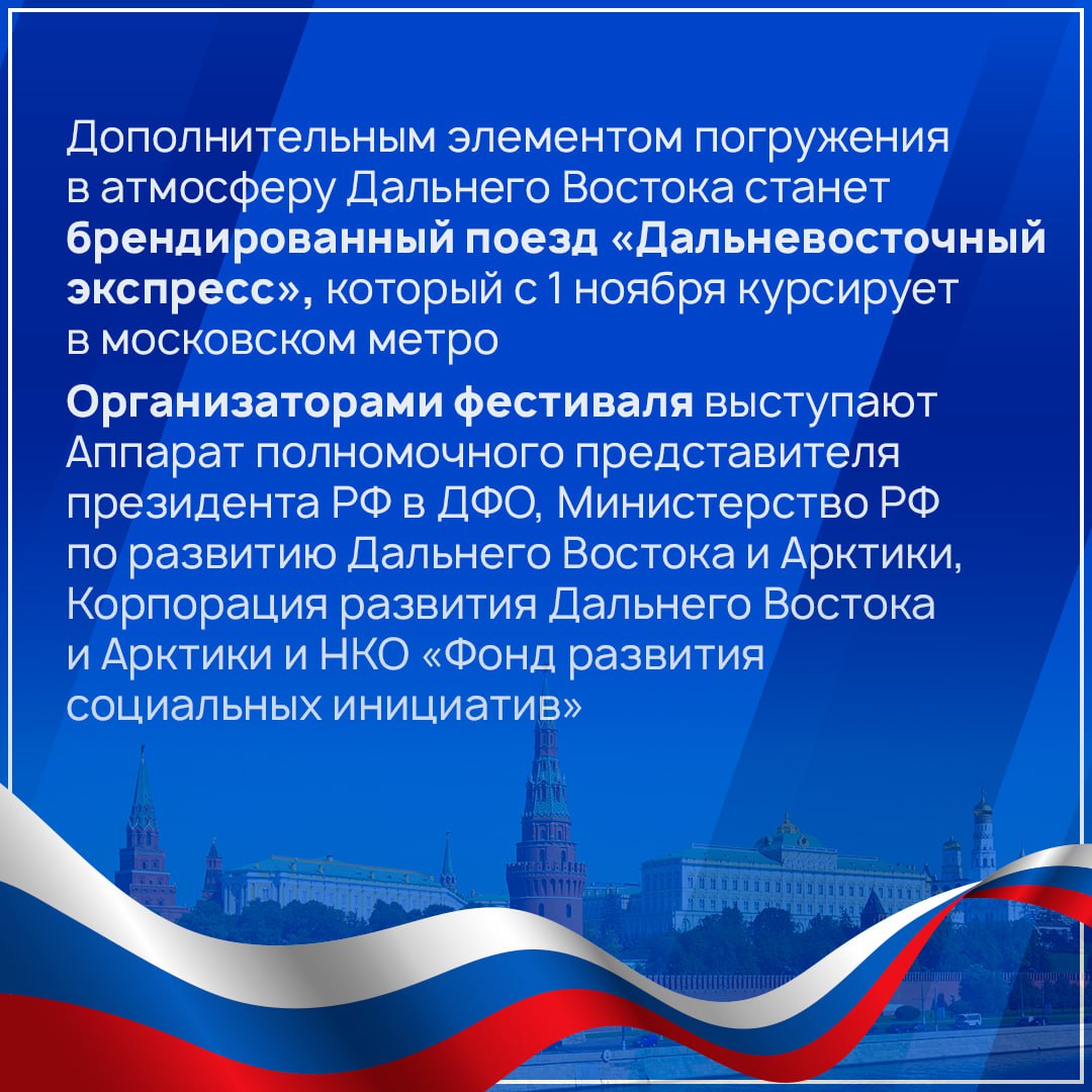 Пришли с напоминанием. Столица России с 1 ноября по 6 декабря 2025 года станет главной площадкой для знакомства с уникальным потенциалом восточных территорий страны. В течение этого времени в Москве будут проходить «Дни регионов Дальнего Востока», в рамках которых запланирована обширная программа культурно-выставочных и деловых мероприятий. Подробнее - в карточках.