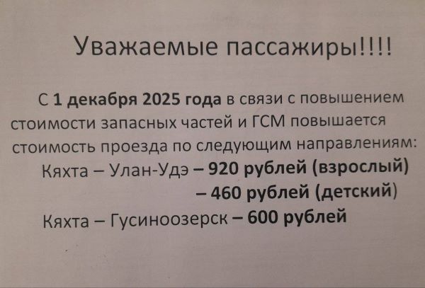 Так, с 1 декабря поездка из Кяхты в Улан-Удэ будет стоить уже 920 рублей для взрослых, в Гусиноозёрск - 600 рублей.
