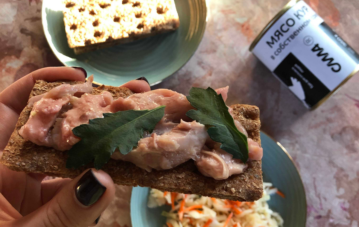 - Бутерброды с куриной тушенкой: Легкий и быстрый рецепт, удивляющий своим вкусом. Достаточно выложить тушенку на гречневые хлебцы и украсить свежей зеленью.