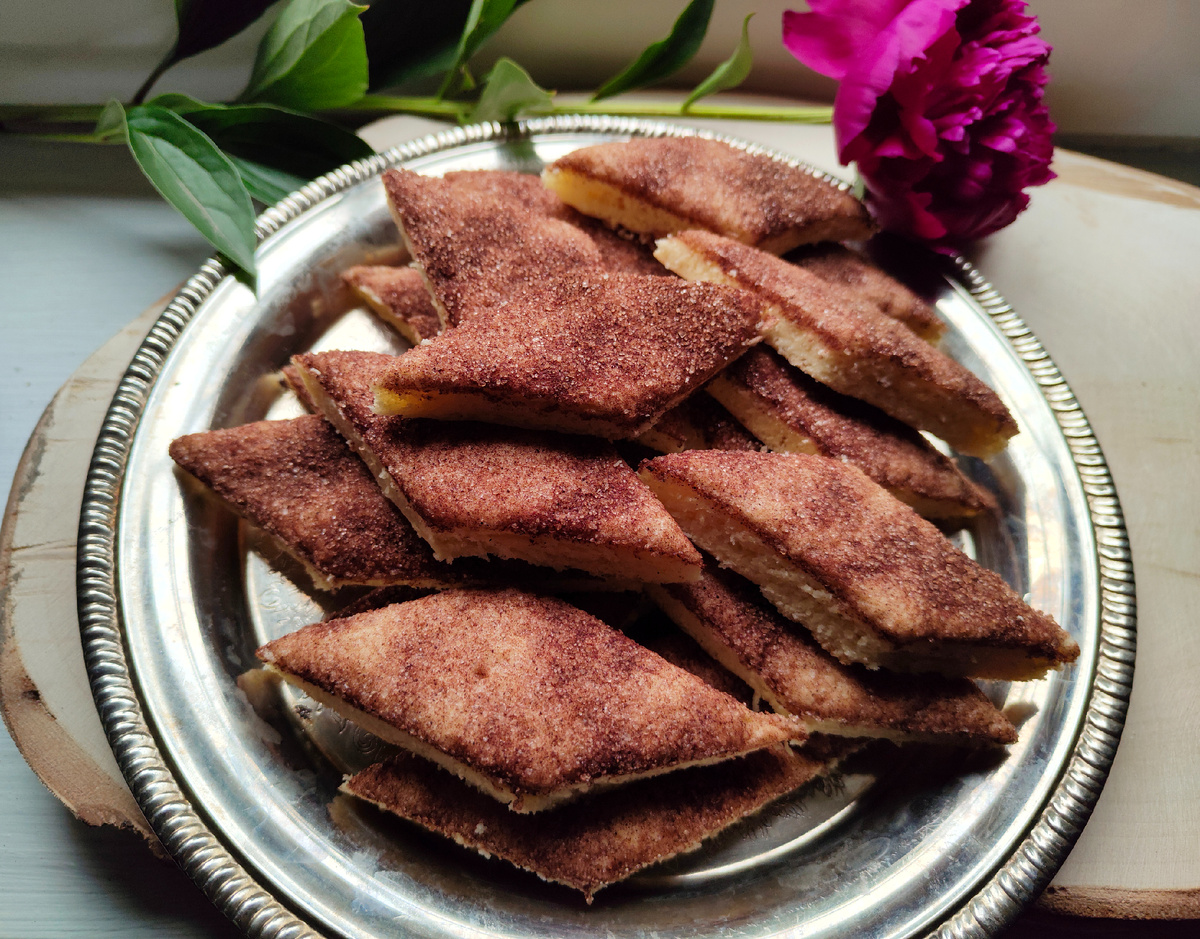 Перенести тесто на противень и смешать оставшиеся 2 ст. ложки сахара с 1 ст. ложкой корицы. Ровно посыпать полученной смесью нарезанное тесто, не забывая про края. Выпекать в духовке примерно 15 минут, пока края не станут золотистыми. После выпекания, пока печенье еще мягкое, аккуратно разрезать его на отдельные кусочки и дать остыть.