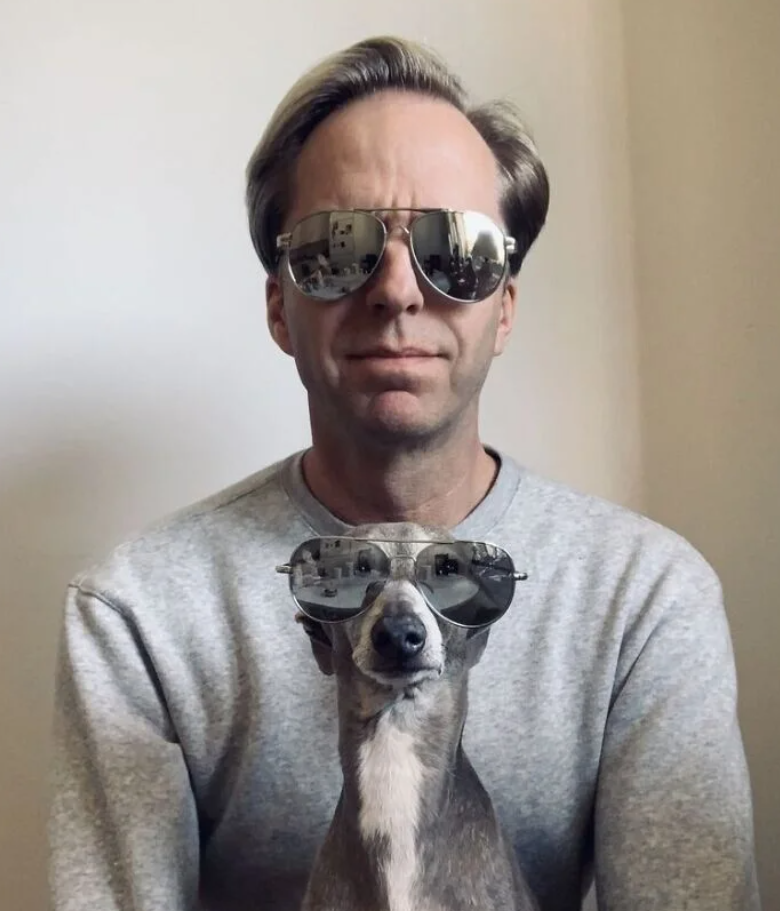 - Собака и хозяин: идеальный тандем. На фотографии оба являются настоящими модниками. У них схожая осанка и уверенное выражение лиц. Пес гордо щеголяет в стильных солнцезащитных очках, а его владелец в сером свитере, безусловно, задает тон.