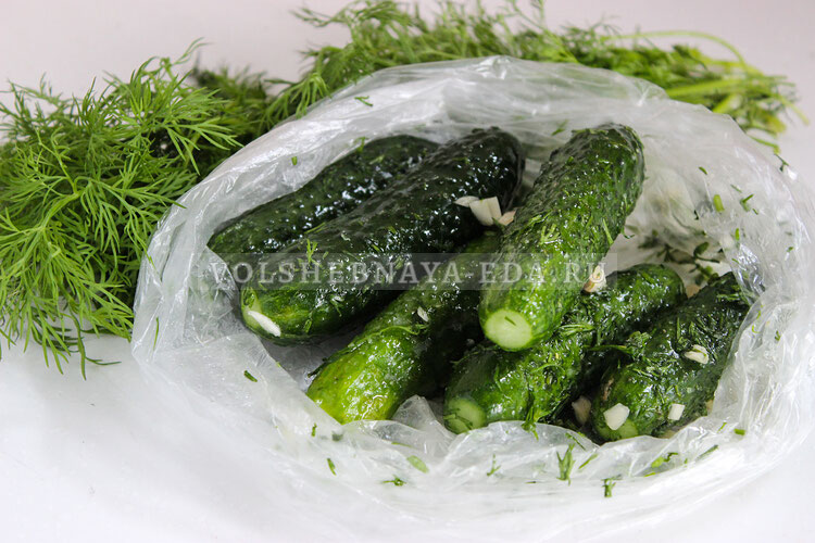 3. Добавьте в пакет с огурцами соль, сахар, рубленый чеснок и укроп. Тщательно перемешайте содержимое, чтобы все ингредиенты равномерно распределились среди огурцов.