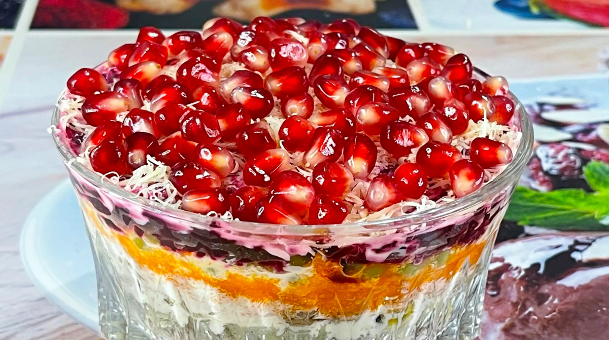 Салат отлично смотрится в прозрачной посуде, украшенный свежей зеленью и зернами граната, добавляя яркий акцент к вашему новогоднему столу. Этот простой в приготовлении, но эффектный салат станет настоящей находкой и обновит классические праздничные угощения.