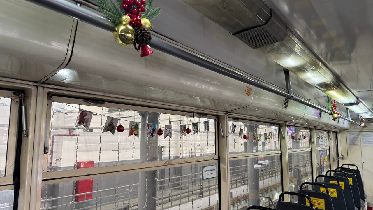 Праздничный вагон с гирляндами и декором курсирует по городу, создавая новогоднее настроение пассажирам. Это трамвай с бортовым номером 98. Отследить его движение можно в приложении «Умный транспорт».