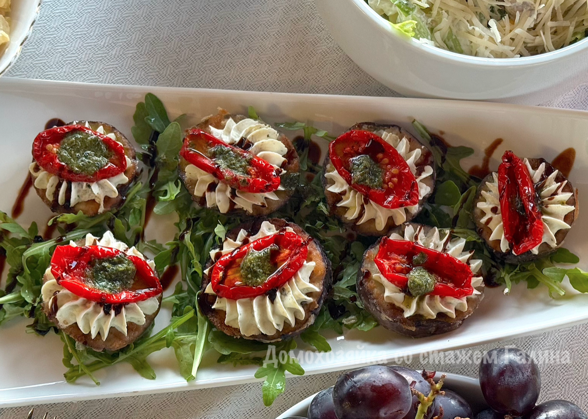 - Отсаживайте начинку на каждый обжаренный баклажан, затем положите сверху вяленые томаты, полейте песто и бальзамическим уксусом. Обязательно добавьте немного соли и перца для баланса.