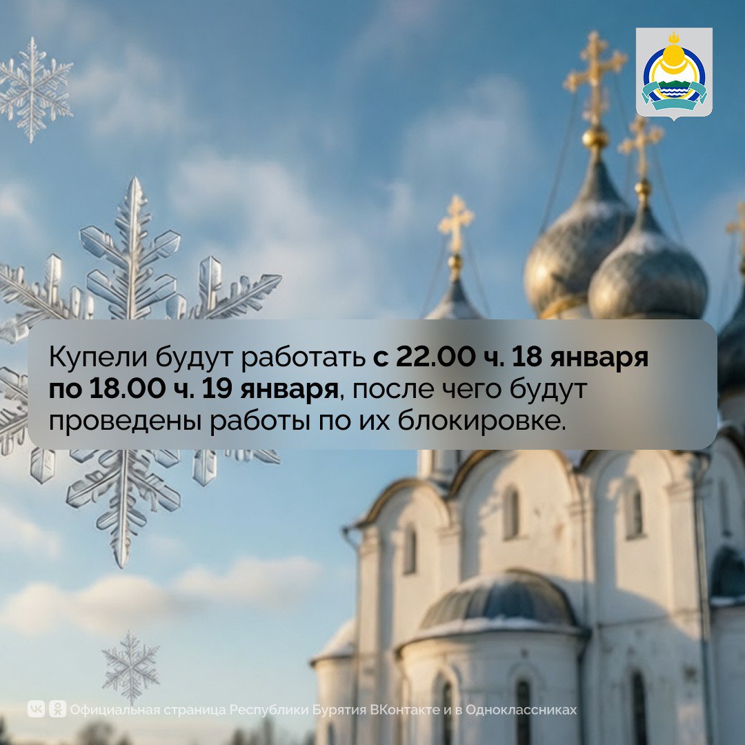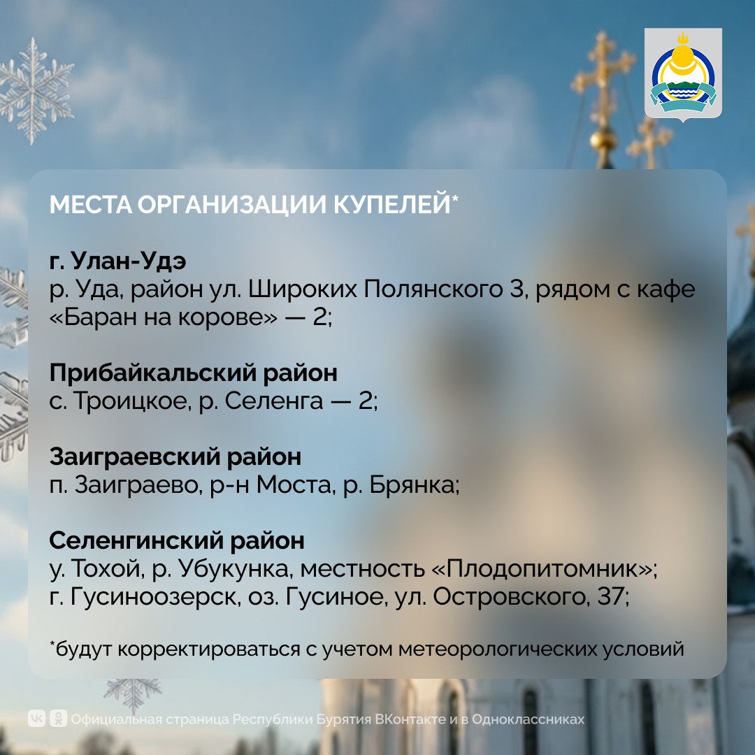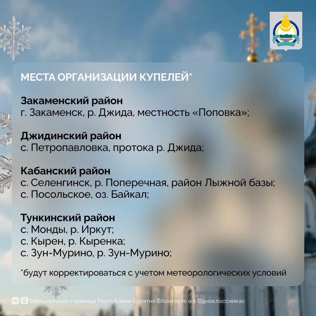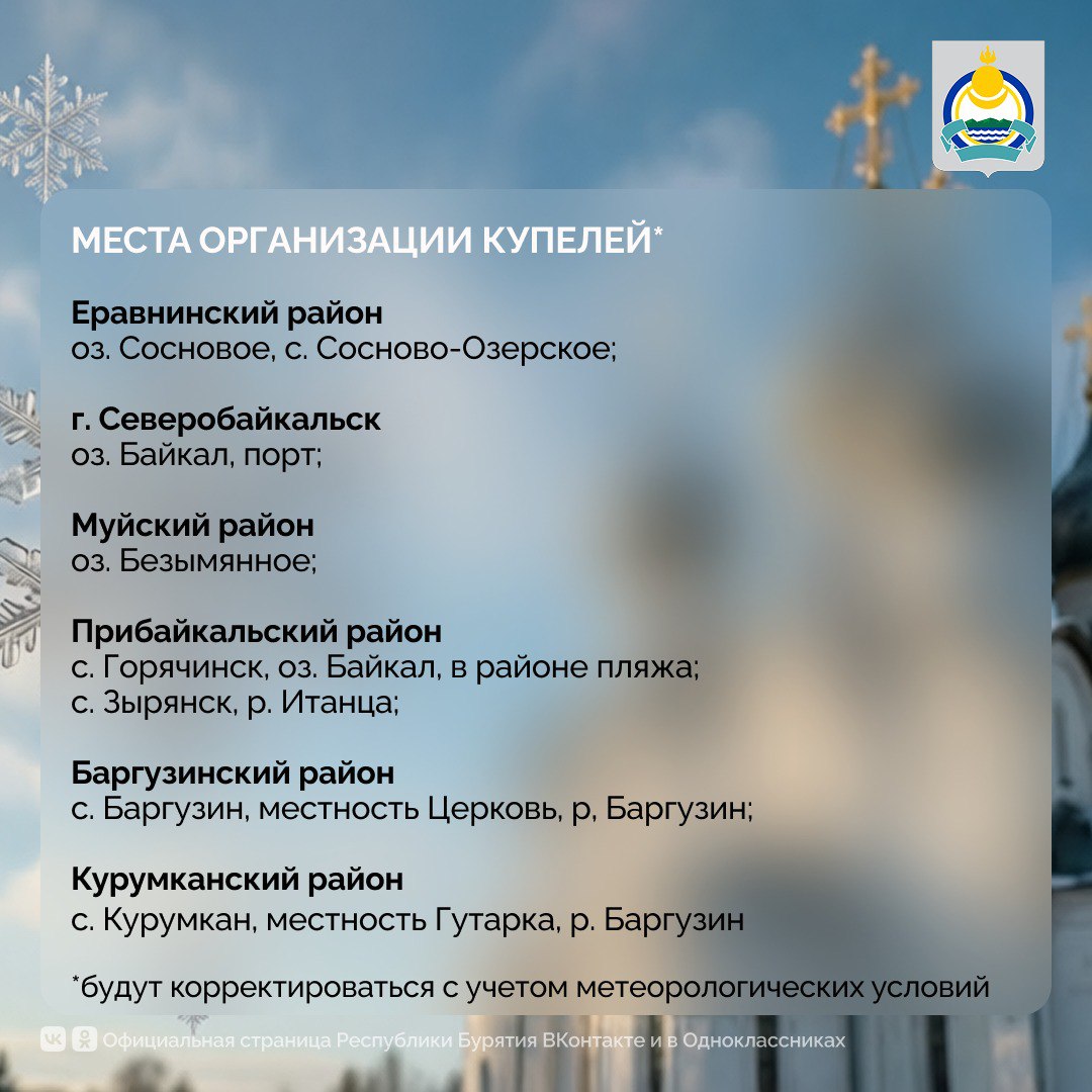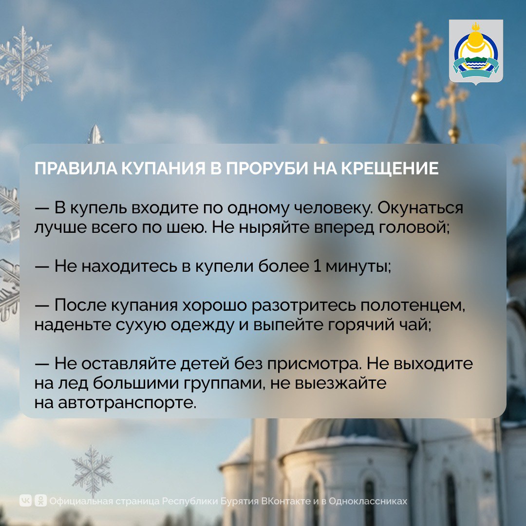 «Главное управление МЧС России по Республике Бурятия призывает окунаться только в специально оборудованных купелях, которые будут подготовлены в соответствии с требованиями безопасности. Категорически запрещено купание в несанкционированных местах, они не соответствуют нормам безопасности и представляют собой угрозу для жизни и здоровья человека. Такие места будут закрываться», — отметил главный государственный инспектор по маломерным судам Республики Бурятия.