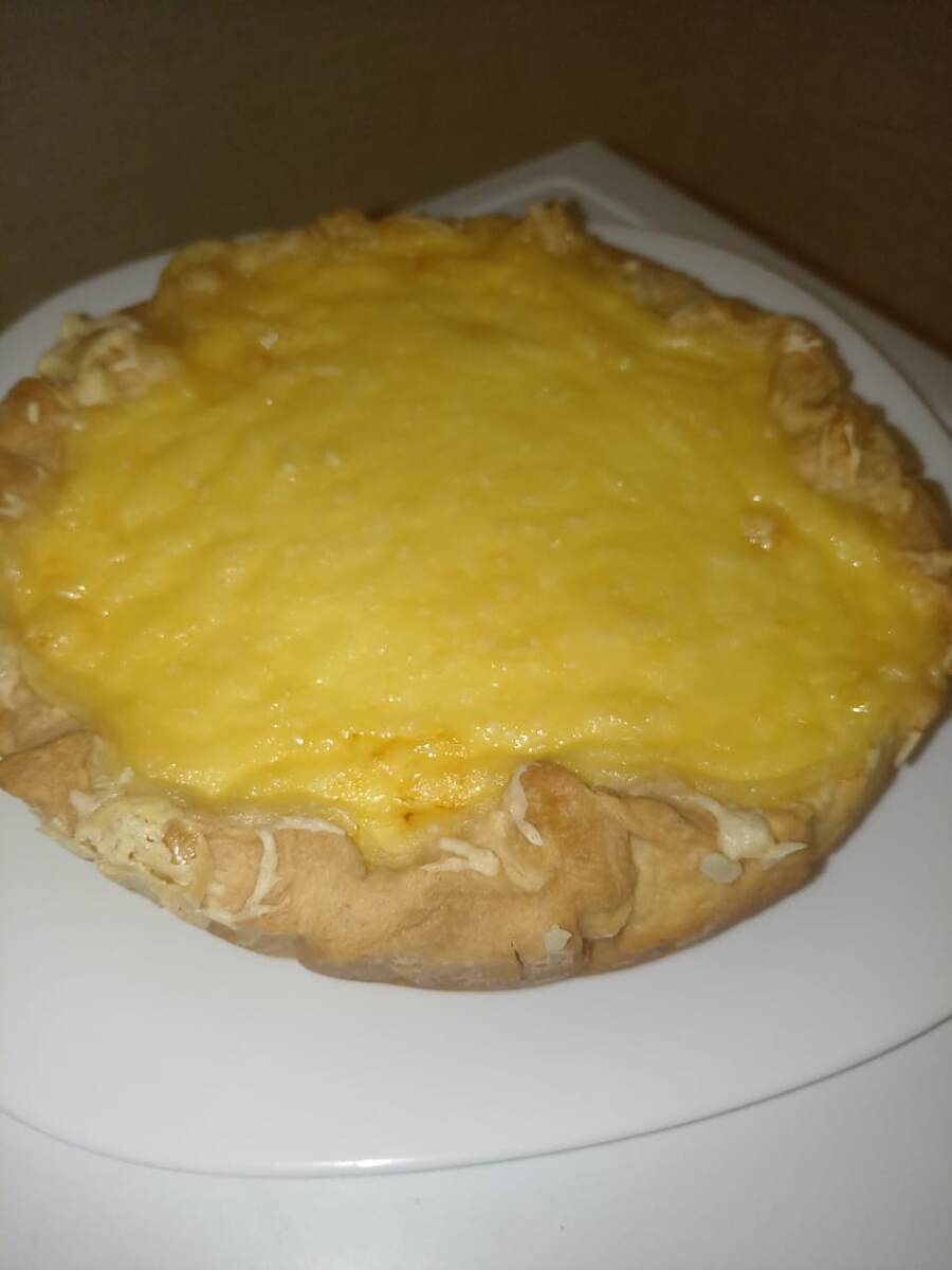 Чтобы сформировать пирог, тесто выкладывают в форму, поднимая бортики. Начинка состоит из 800 граммов лука, обжаренного до золотистого цвета с добавлением соли и перца. Лук укладывается на тесто, затем заливается смесью из банки сметаны и трех яиц. Выпекается в духовке при 190 градусах на протяжении 25 минут. Затем добавляется 150 граммов тертого сыра, и пирог продолжает запекаться еще 10 минут. Пирог остужается и готов к подаче.