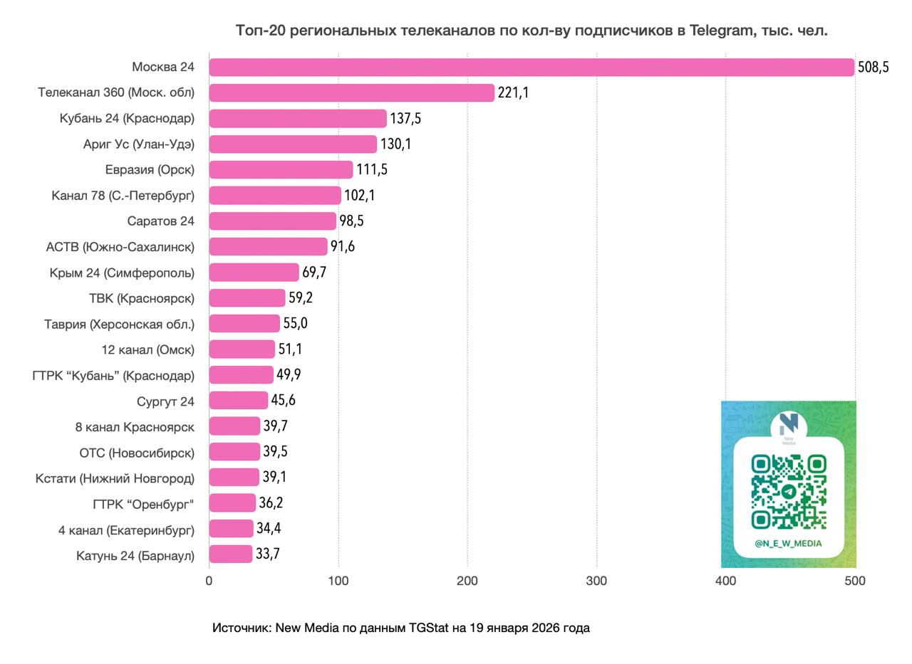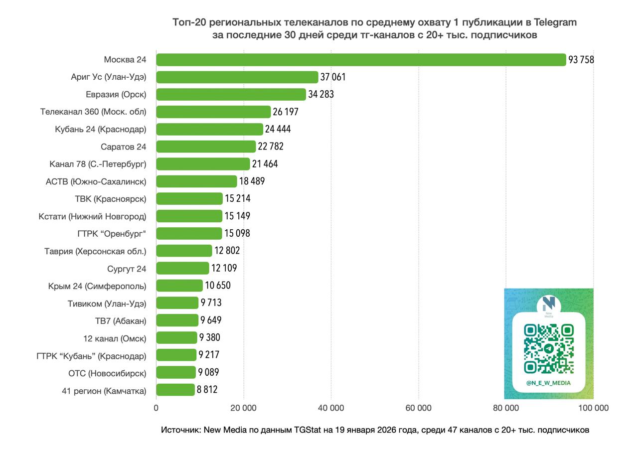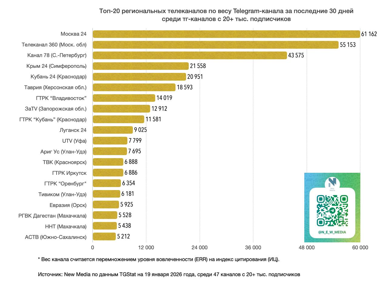 Источник: New Media по данным TGStat на 19 января 2026 года, среди 47 тг-каналов с 20+ тыс. подписчиков
