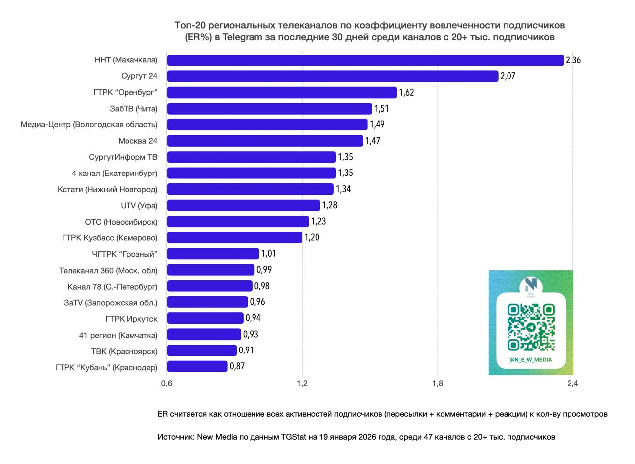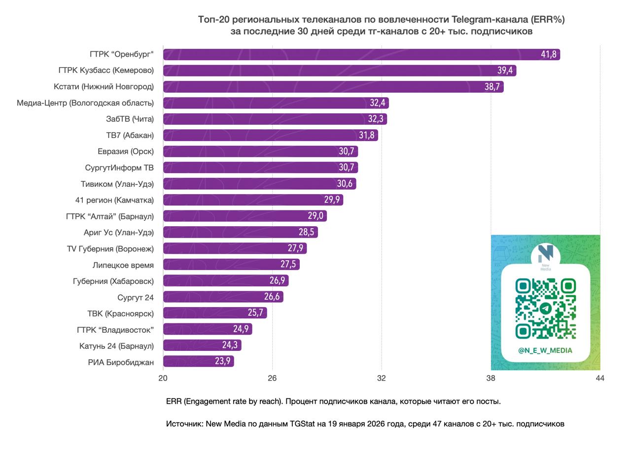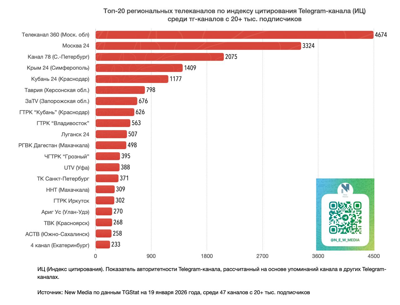 Источник: New Media по данным TGStat на 19 января 2026 года, среди 47 тг-каналов с 20+ тыс. подписчиков