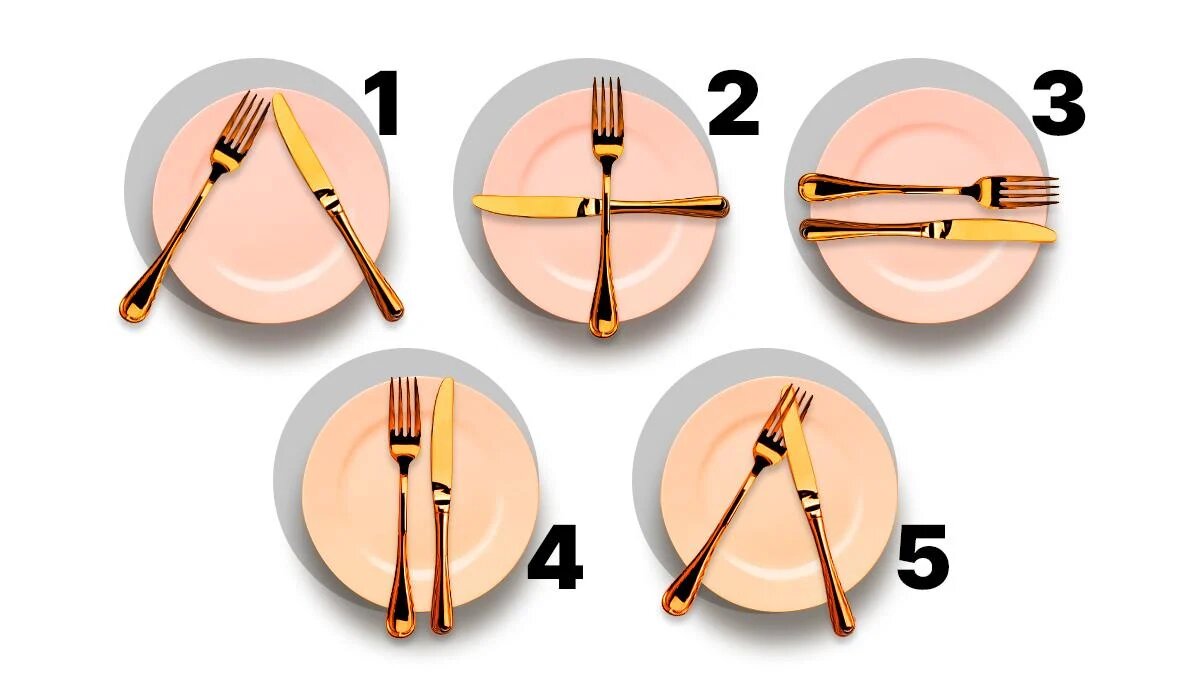 Перед вами пять изображений с различными способами расположения вилки и ножа на тарелке. Представьте, что вы закончили есть. Выберите тот вариант, который наиболее близок вам. Интерпретация покажет, насколько точно были определены ваши характеристики.