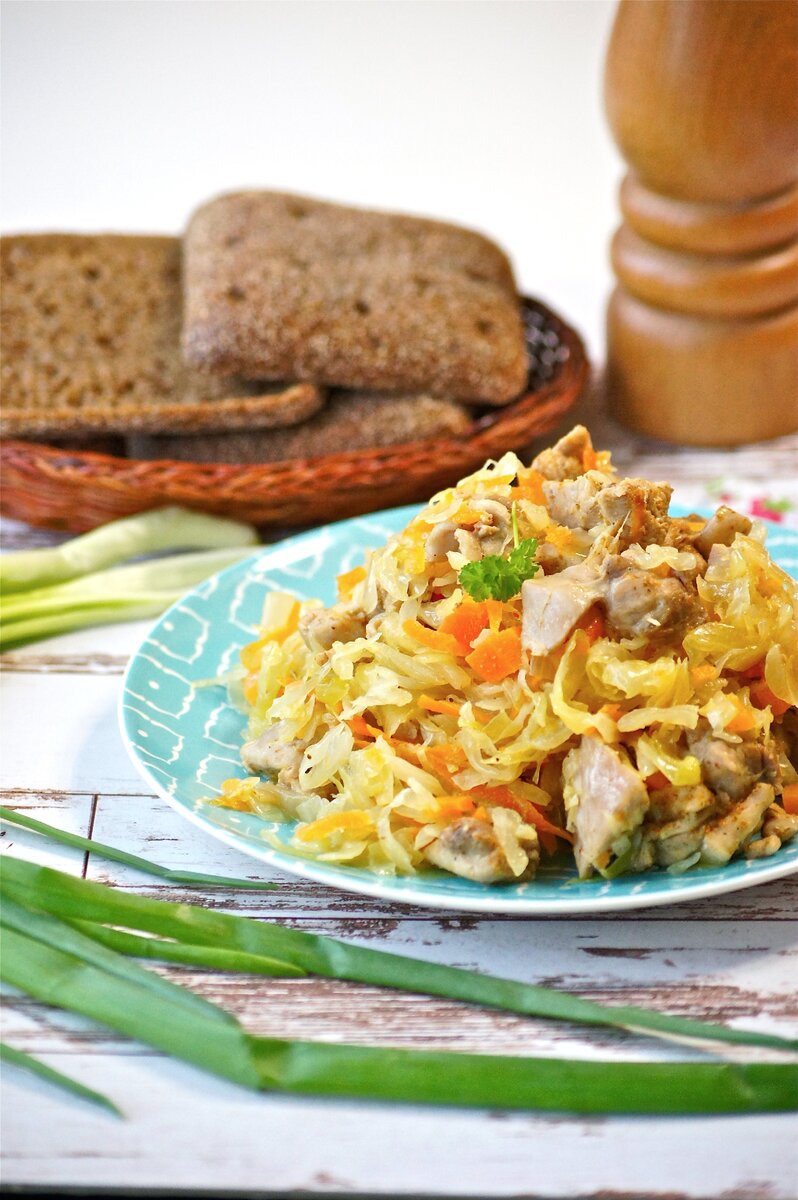 Квашеную капусту, если она слишком кислая, промыть, добавить в сковороду к курице, перемешать, накрыть крышкой и тушить на среднем огне 35-40 минут. Можно также запекать в духовке при температуре 190-200 градусов около 40 минут.