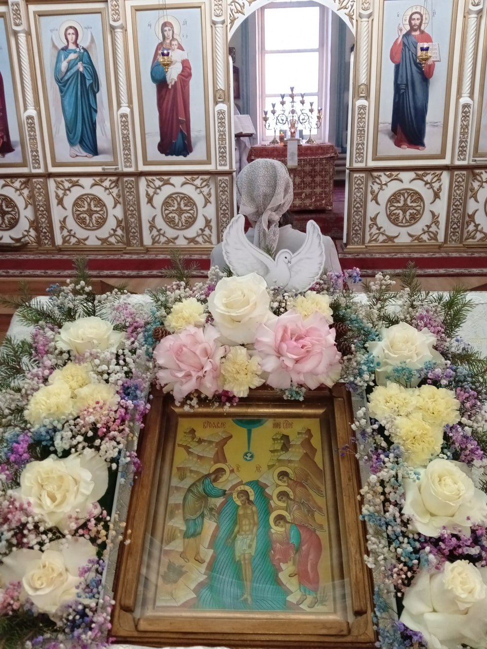 В церкви в честь Успения Пресвятой Богородицы в Кяхте собрались верующие, чтобы отметить вместе Богоявление, поздравить друг друга с праздником и поучаствовать в освящении воды протоиереем Олегом Матвеевым. В церкви царила праздничная атмосфера, батюшка был в белых одеждах, вокруг иконы Крещения Иисуса Христа в реке Иордан с Иоанном Крестителем благоухали розы. Солнце потоками яркого света вливалось в церковь через окна с южной стороны. Было впечатление, что оно озаряет и наполняет своим светом верующих. У всех было приподнятое и праздничное настроение.