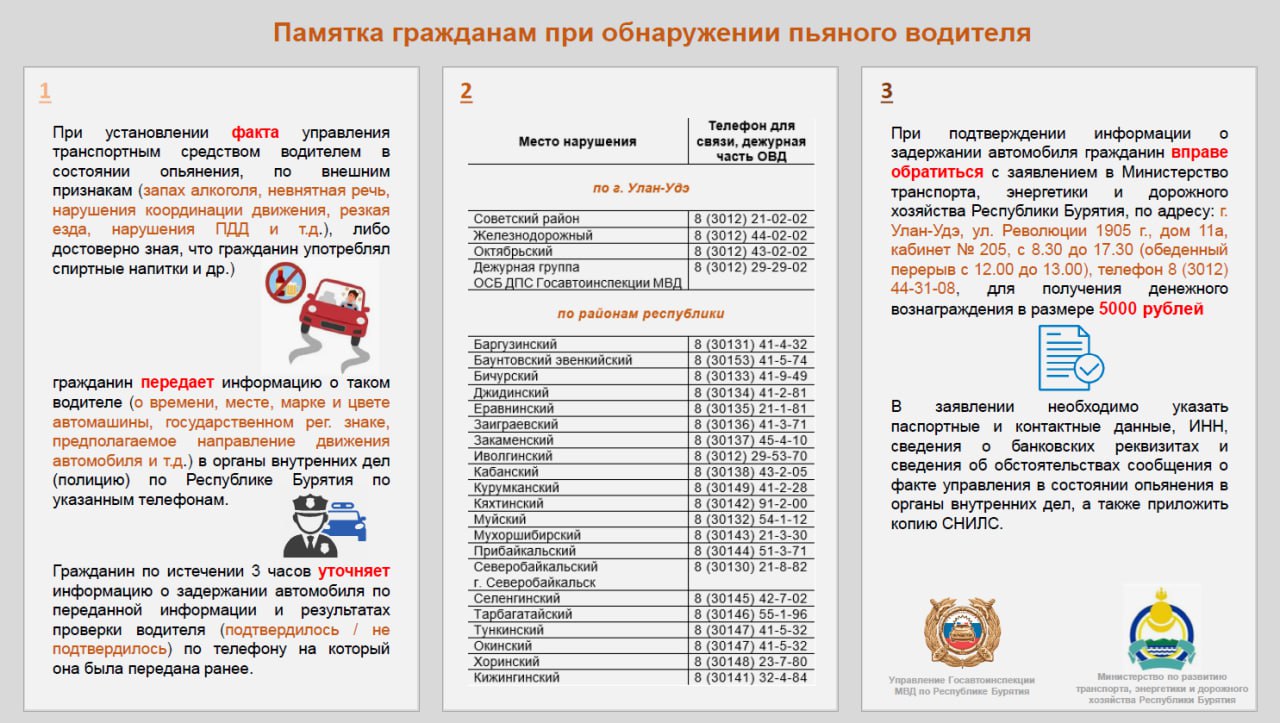 Жители Бурятии имеют право на материальное поощрение в размере 5000 рублей за сведения о водителях, управляющих автомобилями в состоянии алкогольного опьянения.