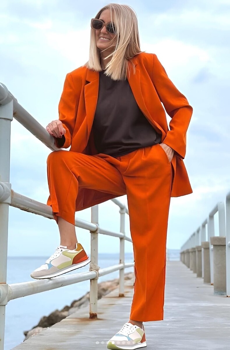 1) Терракотовый костюм с брюками по стрелке и жакетом оверсайз становится ярким акцентом, но не перегружает образ. Черная блуза и белые кроссовки с цветными вставками добавляют свежести и тяготеют к минимализму.