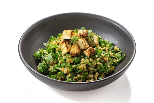 Быстрое решение для будней: минимальные шаги, максимум вкуса. Баклажаны запекаются до золотистости, чечевица варится отдельно и соединяется с рубленной зеленью и чесноком. Всё заправляется маслом, чтобы подчеркнуть каждую травку и создать лёгкую насыщенность без тяжести.