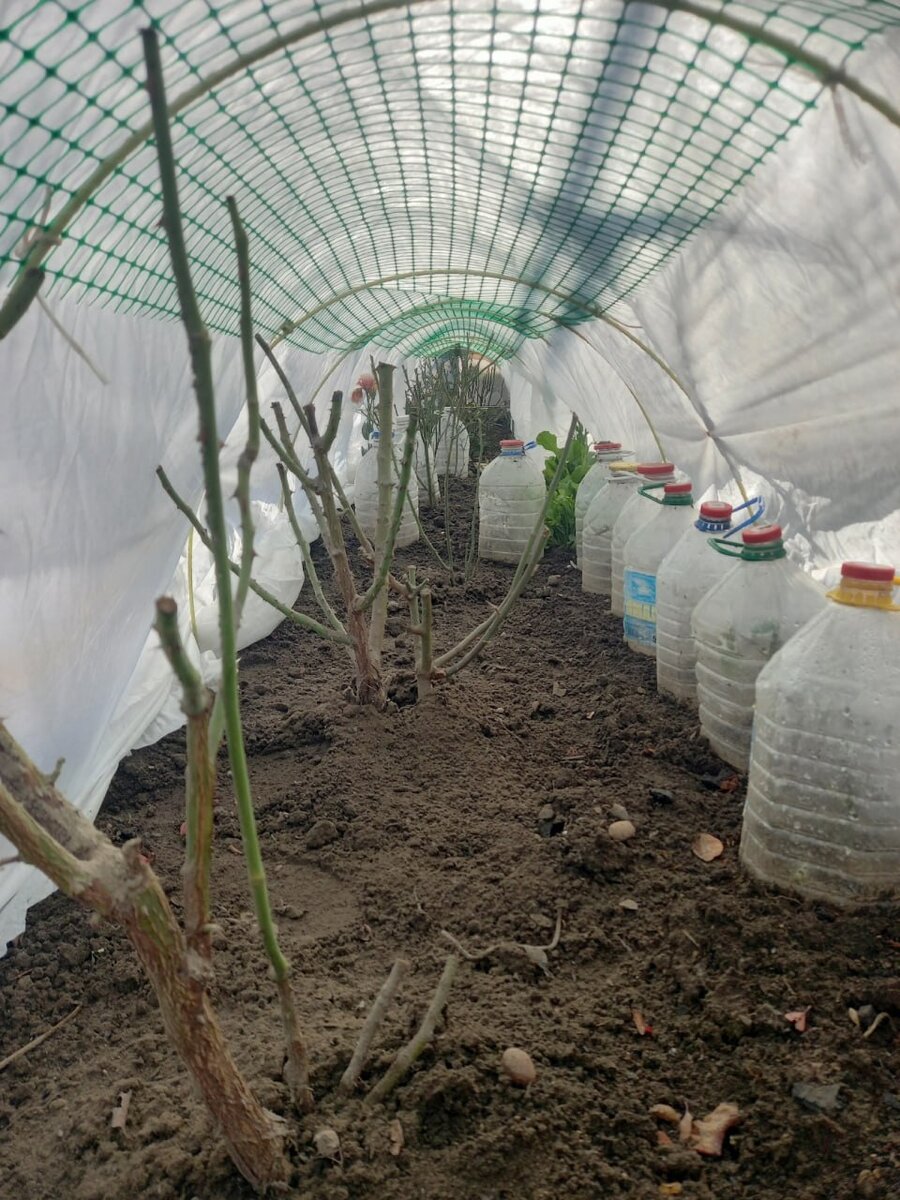 Также можно использовать пластиковые бутылки под укрытием. Это создаст дополнительный барьер от холода, особенно для молодых саженцев. Как показывает практика, розы лучше размещать в ряд. Это облегчает процесс укрытия и повышает эффективность защиты благодаря увеличению объема укрытия и образованию воздушной прослойки.