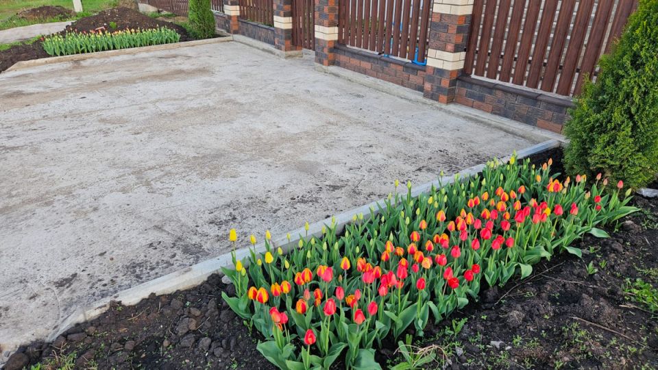 Идея создать пышную клумбу перед забором могла показаться не самой удачной, но для этой местности с ее уникальными условиями она сработала на все 100%. Размеренная посадка луковиц в ряды - три красных, три красно-желтых, три желтых - оказалась настоящим алхимическим рецептом для зрительной композиции.