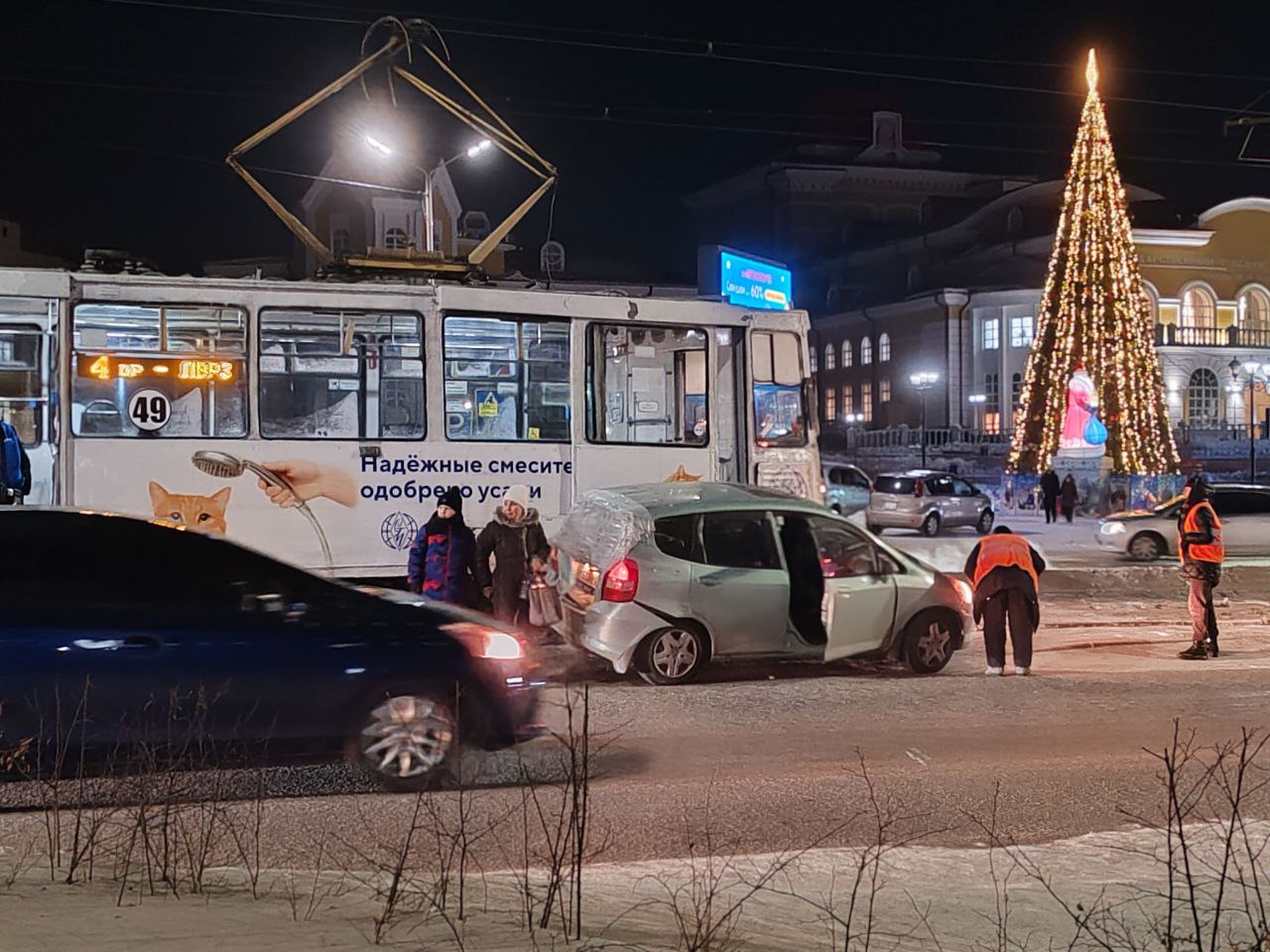 Трамвай протощил легковушку несколько метров.
