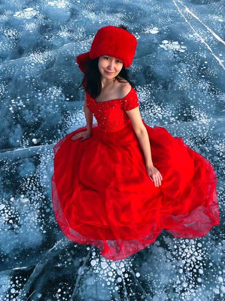 Поэт - песенник из Татарстана Лейсан Сабитова приехала на Байкал, специально чтобы сделать потрясающее фото в воздушном ярко – красном платье. Год назад почти в таком же на этом же льду каталась известная фигуристка Алина Загитова (см по ссылке выше ) .