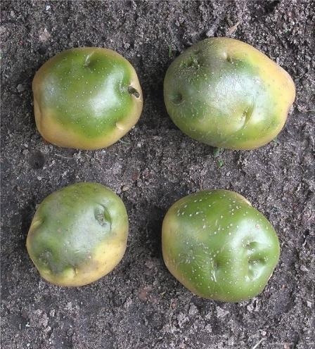 - Полностью удалять зелёную кожуру и часть мякоти вокруг неё; при сильном поражении клубни лучше выбросить.