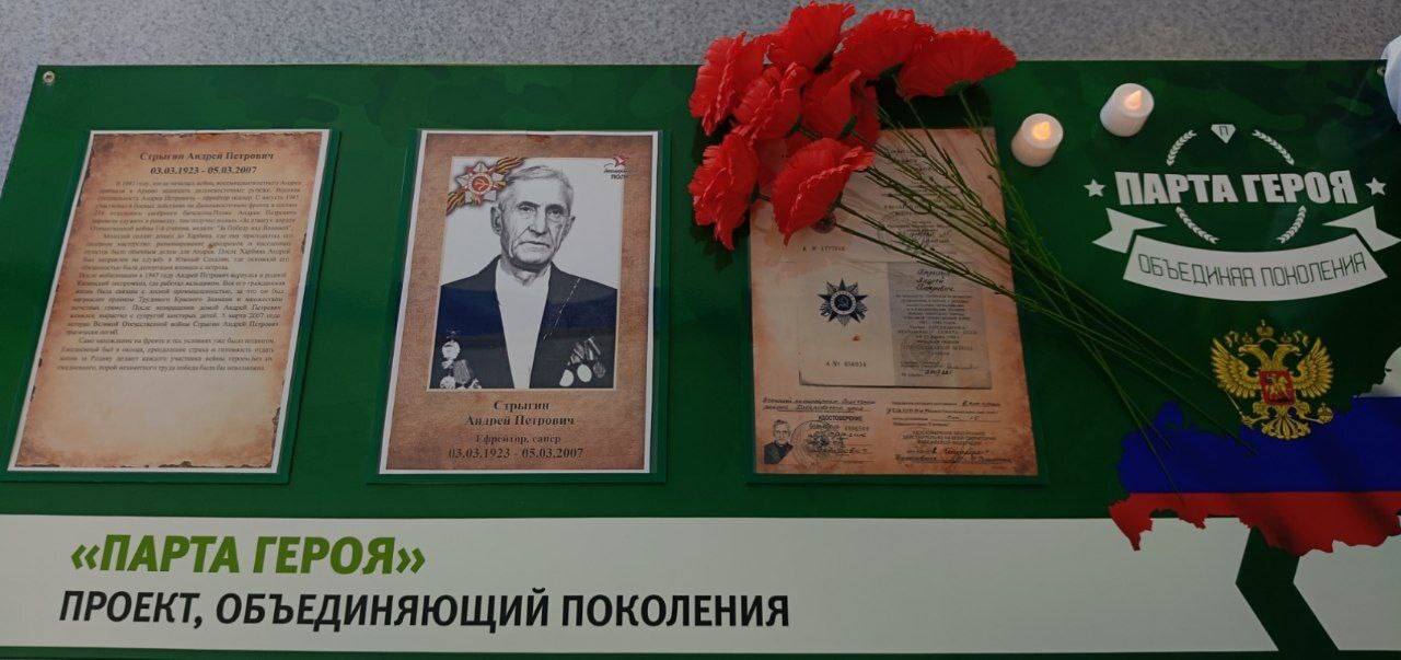 В школе поселка Харпичан Солнечного округа Хабаровского края появилась «Парта Героя». Ее открыли в честь ветерана Великой Отечественной войны Стрыгина Андрея Петровича.