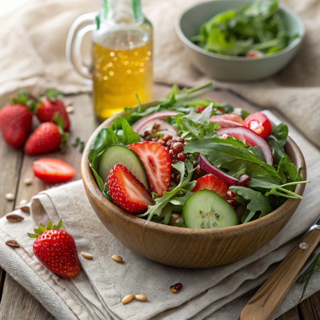 Салат с клубникой и рукколой — это не просто кулинарный шедевр, но и истинный праздник для вашего организма. Этот легкий и яркий микс доказал, что зелень не ограничивается лишь «передвижением» котлеты на тарелке. Клубника дарит заряд витамина C и радости, а руккола добавляет пикантную ноту, предоставляя при этом витамин K. Такой состав становится идеальным выбором для восстановления после интенсивных тренировок, сочетая антиоксиданты, легкие углеводы и растительный белок — теперь даже мускулы не будут против.